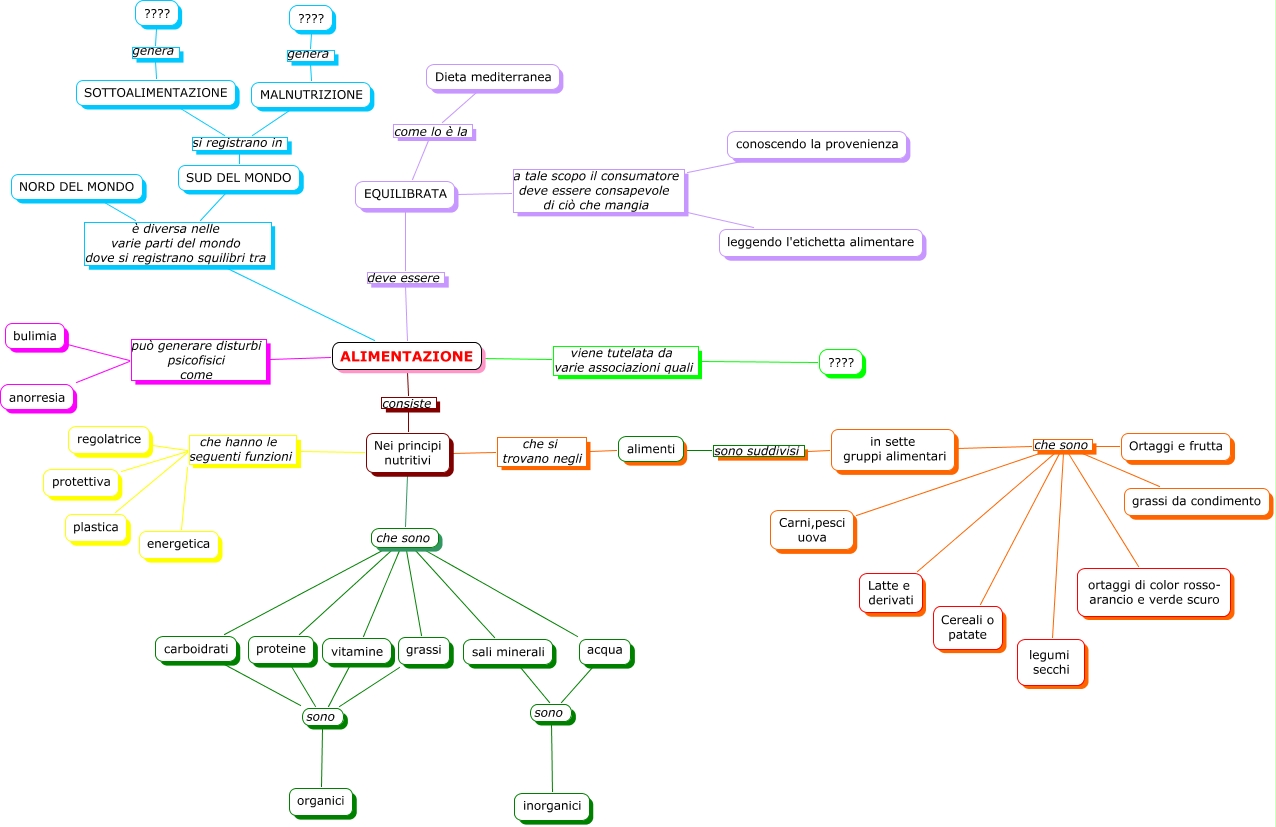 Questa Cmap, creata con IHMC CmapTools, contiene informazioni relative a: Alimentazione Novielli E-S,Attolico,Mastrorocco,Trotti, Nei principi nutritivi che sono vitamine, EQUILIBRATA a tale scopo il consumatore deve essere consapevole di ciò che mangia conoscendo la provenienza, ALIMENTAZIONE consiste Nei principi nutritivi, alimenti sono suddivisi in sette gruppi alimentari, SOTTOALIMENTAZIONE genera ????, ALIMENTAZIONE è diversa nelle varie parti del mondo dove si registrano squilibri tra SUD DEL MONDO, grassi sono organici, SUD DEL MONDO si registrano in SOTTOALIMENTAZIONE, EQUILIBRATA come lo è la Dieta mediterranea, Nei principi nutritivi che sono acqua, SUD DEL MONDO si registrano in MALNUTRIZIONE, vitamine sono organici, ALIMENTAZIONE viene tutelata da varie associazioni quali ????, carboidrati sono organici, in sette gruppi alimentari che sono ortaggi di color rosso- arancio e verde scuro, Nei principi nutritivi che sono proteine, proteine sono organici, in sette gruppi alimentari che sono Carni,pesci uova, sali minerali sono inorganici, ALIMENTAZIONE deve essere EQUILIBRATA