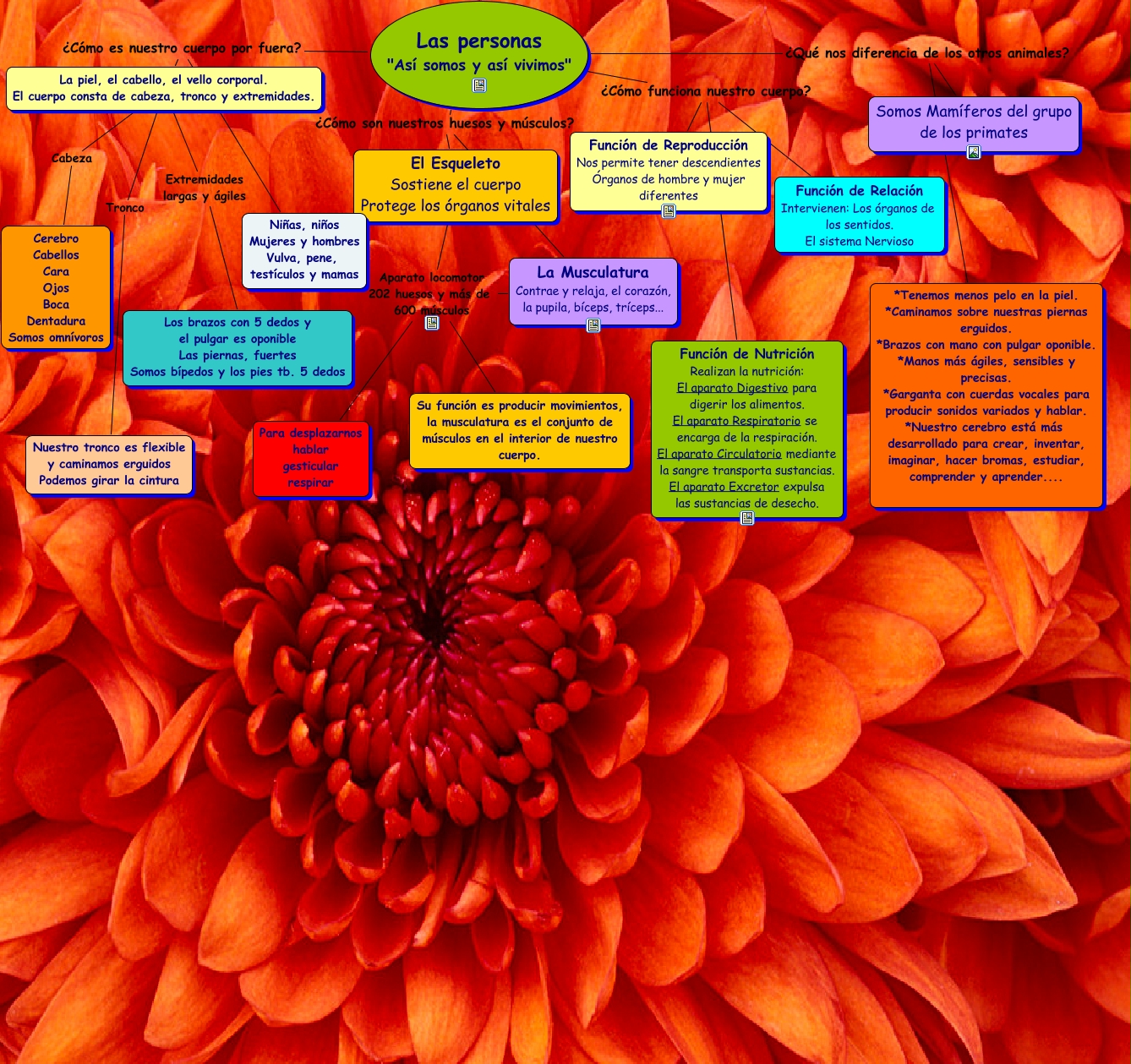 Este Cmap, tiene información relacionada con: Las personas Asi somos y asi vivimos MAngeles Del Alamo Cañamero, Las personas "Así somos y así vivimos" ¿Cómo funciona nuestro cuerpo? Función de Nutrición Realizan la nutrición: El aparato Digestivo para digerir los alimentos. El aparato Respiratorio se encarga de la respiración. El aparato Circulatorio mediante la sangre transporta sustancias. El aparato Excretor expulsa las sustancias de desecho., El Esqueleto Sostiene el cuerpo Protege los órganos vitales Aparato locomotor 202 huesos y más de 600 músculos Para desplazarnos hablar gesticular respirar, La piel, el cabello, el vello corporal. El cuerpo consta de cabeza, tronco y extremidades. Cabeza Cerebro Cabellos Cara Ojos Boca Dentadura Somos omnívoros, Las personas "Así somos y así vivimos" ¿Cómo son nuestros huesos y músculos? La Musculatura Contrae y relaja, el corazón, la pupila, bíceps, tríceps..., La piel, el cabello, el vello corporal. El cuerpo consta de cabeza, tronco y extremidades. Tronco Nuestro tronco es flexible y caminamos erguidos Podemos girar la cintura, Las personas "Así somos y así vivimos" ¿Cómo es nuestro cuerpo por fuera? Niñas, niños Mujeres y hombres Vulva, pene, testículos y mamas, Las personas "Así somos y así vivimos" ¿Qué nos diferencia de los otros animales? *Tenemos menos pelo en la piel. *Caminamos sobre nuestras piernas erguidos. *Brazos con mano con pulgar oponible. *Manos más ágiles, sensibles y precisas. *Garganta con cuerdas vocales para producir sonidos variados y hablar. *Nuestro cerebro está más desarrollado para crear, inventar, imaginar, hacer bromas, estudiar, comprender y aprender...., La Musculatura Contrae y relaja, el corazón, la pupila, bíceps, tríceps... Aparato locomotor 202 huesos y más de 600 músculos Su función es producir movimientos, la musculatura es el conjunto de músculos en el interior de nuestro cuerpo., Las personas "Así somos y así vivimos" ¿Cómo funciona nuestro cuerpo? Función de Relación Intervienen: Los órganos de los sentidos. El sistema Nervioso, La Musculatura Contrae y relaja, el corazón, la pupila, bíceps, tríceps... Aparato locomotor 202 huesos y más de 600 músculos Para desplazarnos hablar gesticular respirar, Las personas "Así somos y así vivimos" ¿Cómo son nuestros huesos y músculos? El Esqueleto Sostiene el cuerpo Protege los órganos vitales, Las personas "Así somos y así vivimos" ¿Cómo es nuestro cuerpo por fuera? La piel, el cabello, el vello corporal. El cuerpo consta de cabeza, tronco y extremidades., Las personas "Así somos y así vivimos" ¿Qué nos diferencia de los otros animales? Somos Mamíferos del grupo de los primates, La piel, el cabello, el vello corporal. El cuerpo consta de cabeza, tronco y extremidades. Extremidades largas y ágiles Los brazos con 5 dedos y el pulgar es oponible Las piernas, fuertes Somos bípedos y los pies tb. 5 dedos, Las personas "Así somos y así vivimos" ¿Cómo funciona nuestro cuerpo? Función de Reproducción Nos permite tener descendientes Órganos de hombre y mujer diferentes, El Esqueleto Sostiene el cuerpo Protege los órganos vitales Aparato locomotor 202 huesos y más de 600 músculos Su función es producir movimientos, la musculatura es el conjunto de músculos en el interior de nuestro cuerpo.