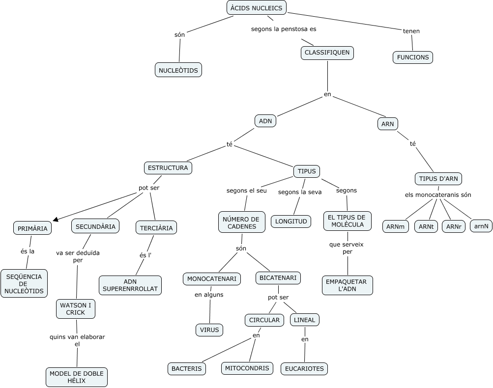 Este Cmap, tiene información relacionada con: àcids nucleics, LINEAL en EUCARIOTES, NÚMERO DE CADENES són BICATENARI, CIRCULAR en MITOCONDRIS, TIPUS segons la seva LONGITUD, TIPUS D'ARN els monocateranis són arnN, CLASSIFIQUEN en ARN, CIRCULAR en BACTERIS, ÀCIDS NUCLEICS segons la penstosa es CLASSIFIQUEN, ÀCIDS NUCLEICS tenen FUNCIONS, CLASSIFIQUEN en ADN, TIPUS D'ARN els monocateranis són ARNr, EL TIPUS DE MOLÈCULA que serveix per EMPAQUETAR L'ADN, PRIMÀRIA és la SEQÜENCIA DE NUCLEÒTIDS, ESTRUCTURA pot ser PRIMÀRIA, ADN té ESTRUCTURA, TIPUS D'ARN els monocateranis són ARNt, TIPUS segons el seu NÚMERO DE CADENES, BICATENARI pot ser CIRCULAR, SECUNDÀRIA va ser deduïda per WATSON I CRICK, ARN té TIPUS D'ARN