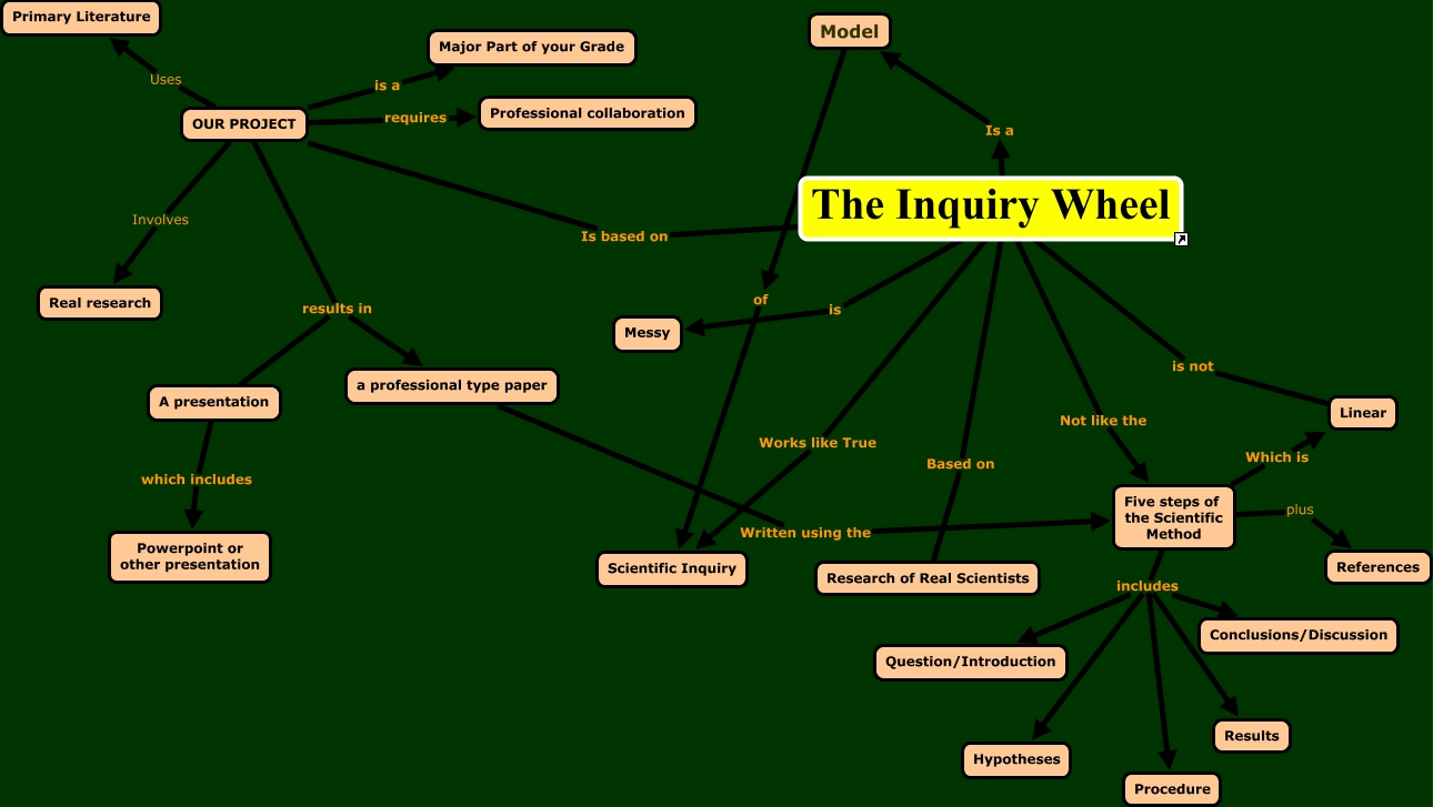 This Concept Map, created with IHMC CmapTools, has information related to: Inquiry, A presentation which includes Powerpoint or other presentation, Five steps of the Scientific Method plus References, Five steps of the Scientific Method includes Results, Five steps of the Scientific Method includes Hypotheses, Inquiry Wheel Works like True Scientific Inquiry, Inquiry Wheel Not like the Five steps of the Scientific Method, Inquiry Wheel is Messy, Inquiry Wheel Is a Model, Five steps of the Scientific Method includes Procedure, Five steps of the Scientific Method Which is Linear, Inquiry Wheel is not Linear, OUR PROJECT Uses Primary Literature, Five steps of the Scientific Method includes Question/Introduction, OUR PROJECT results in A presentation, Inquiry Wheel ???? The Inquiry Wheel, Model of Scientific Inquiry, OUR PROJECT requires Professional collaboration, a professional type paper Written using the Five steps of the Scientific Method, OUR PROJECT results in a professional type paper, OUR PROJECT Is based on Inquiry Wheel