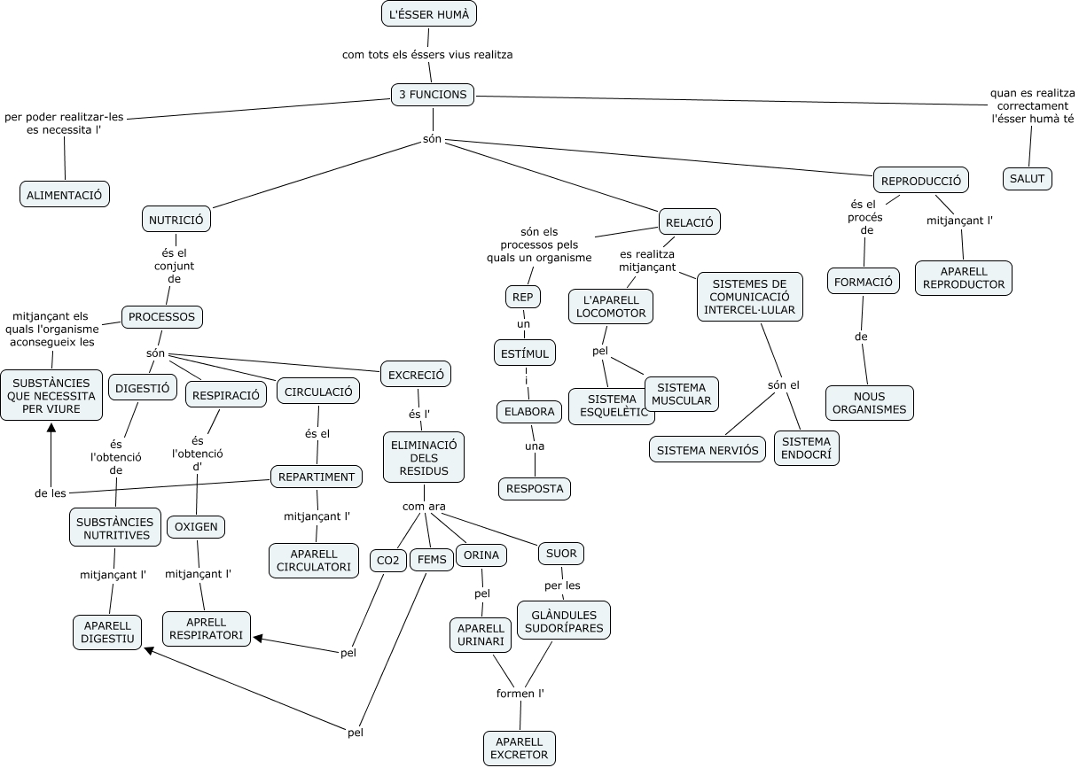 Este Cmap, tiene información relacionada con: ELS APARELLS, PROCESSOS mitjançant els quals l'organisme aconsegueix les SUBSTÀNCIES QUE NECESSITA PER VIURE, L'APARELL LOCOMOTOR pel SISTEMA ESQUELÈTIC, RELACIÓ es realitza mitjançant L'APARELL LOCOMOTOR, ELABORA una RESPOSTA, EXCRECIÓ és l' ELIMINACIÓ DELS RESIDUS, RELACIÓ es realitza mitjançant SISTEMES DE COMUNICACIÓ INTERCEL·LULAR, SISTEMES DE COMUNICACIÓ INTERCEL·LULAR són el SISTEMA NERVIÓS, SUBSTÀNCIES NUTRITIVES mitjançant l' APARELL DIGESTIU, ELIMINACIÓ DELS RESIDUS com ara ORINA, 3 FUNCIONS són RELACIÓ, OXIGEN mitjançant l' APRELL RESPIRATORI, CIRCULACIÓ són DIGESTIÓ, REPARTIMENT mitjançant l' APARELL CIRCULATORI, CO2 pel APRELL RESPIRATORI, 3 FUNCIONS són REPRODUCCIÓ, APARELL URINARI formen l' APARELL EXCRETOR, ESTÍMUL i ELABORA, ELIMINACIÓ DELS RESIDUS com ara FEMS, REP un ESTÍMUL, FEMS pel APARELL DIGESTIU
