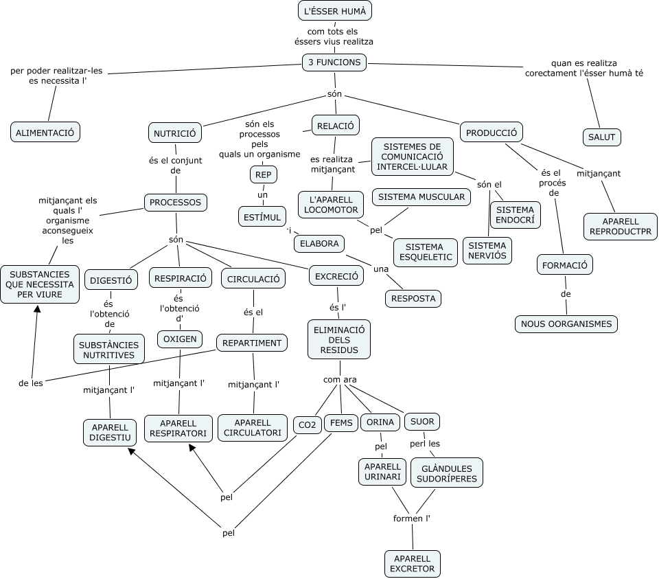 Este Cmap, tiene información relacionada con: els aparells, REP un ESTÍMUL, FEMS pel APARELL DIGESTIU, PRODUCCIÓ mitjançant APARELL REPRODUCTPR, PROCESSOS són RESPIRACIÓ, ELIMINACIÓ DELS RESIDUS com ara FEMS, GLÀNDULES SUDORÍPERES formen l' APARELL URINARI, PROCESSOS són EXCRECIÓ, ELIMINACIÓ DELS RESIDUS com ara SUOR, SUBSTÀNCIES NUTRITIVES mitjançant l' APARELL DIGESTIU, NUTRICIÓ és el conjunt de PROCESSOS, PROCESSOS són CIRCULACIÓ, GLÀNDULES SUDORÍPERES formen l' APARELL EXCRETOR, CIRCULACIÓ és el REPARTIMENT, 3 FUNCIONS per poder realitzar-les es necessita l' ALIMENTACIÓ, RELACIÓ són els processos pels quals un organisme REP, RELACIÓ es realitza mitjançant SISTEMES DE COMUNICACIÓ INTERCEL·LULAR, REPARTIMENT de les SUBSTANCIES QUE NECESSITA PER VIURE, SISTEMES DE COMUNICACIÓ INTERCEL·LULAR són el SISTEMA NERVIÓS, DIGESTIÓ és l'obtenció de SUBSTÀNCIES NUTRITIVES, CO2 pel APARELL RESPIRATORI
