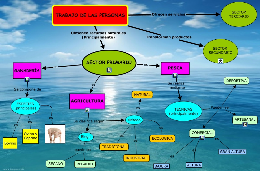 Este Cmap, tiene información relacionada con: Trabajos, Método es TRADICIONAL, AGRICULTURA Se clasifica según Riego, TÉCNICAS (principalmente) Pueden ser DEPORTIVA, GANADERÍA Se compone de ESPECIES (principales), SECTOR PRIMARIO es GANADERÍA, PESCA Se realiza mediante TÉCNICAS (principalmente), Método es NATURAL, Método es ECOLOGICA, TÉCNICAS (principalmente) Pueden ser COMERCIAL, Método es INDUSTRIAL, TRABAJO DE LAS PERSONAS Obtienen recursos naturales (Principalmente) SECTOR PRIMARIO, TÉCNICAS (principalmente) Pueden ser ARTESANAL, ESPECIES (principales) es, TRABAJO DE LAS PERSONAS Transforman productos SECTOR SECUNDARIO, SECTOR PRIMARIO es AGRICULTURA, TRABAJO DE LAS PERSONAS Ofrecen servicios SECTOR TERCIARIO, ESPECIES (principales) es Bovino, ESPECIES (principales) es Ovino y Caprino, COMERCIAL es GRAN ALTURA, COMERCIAL es ALTURA