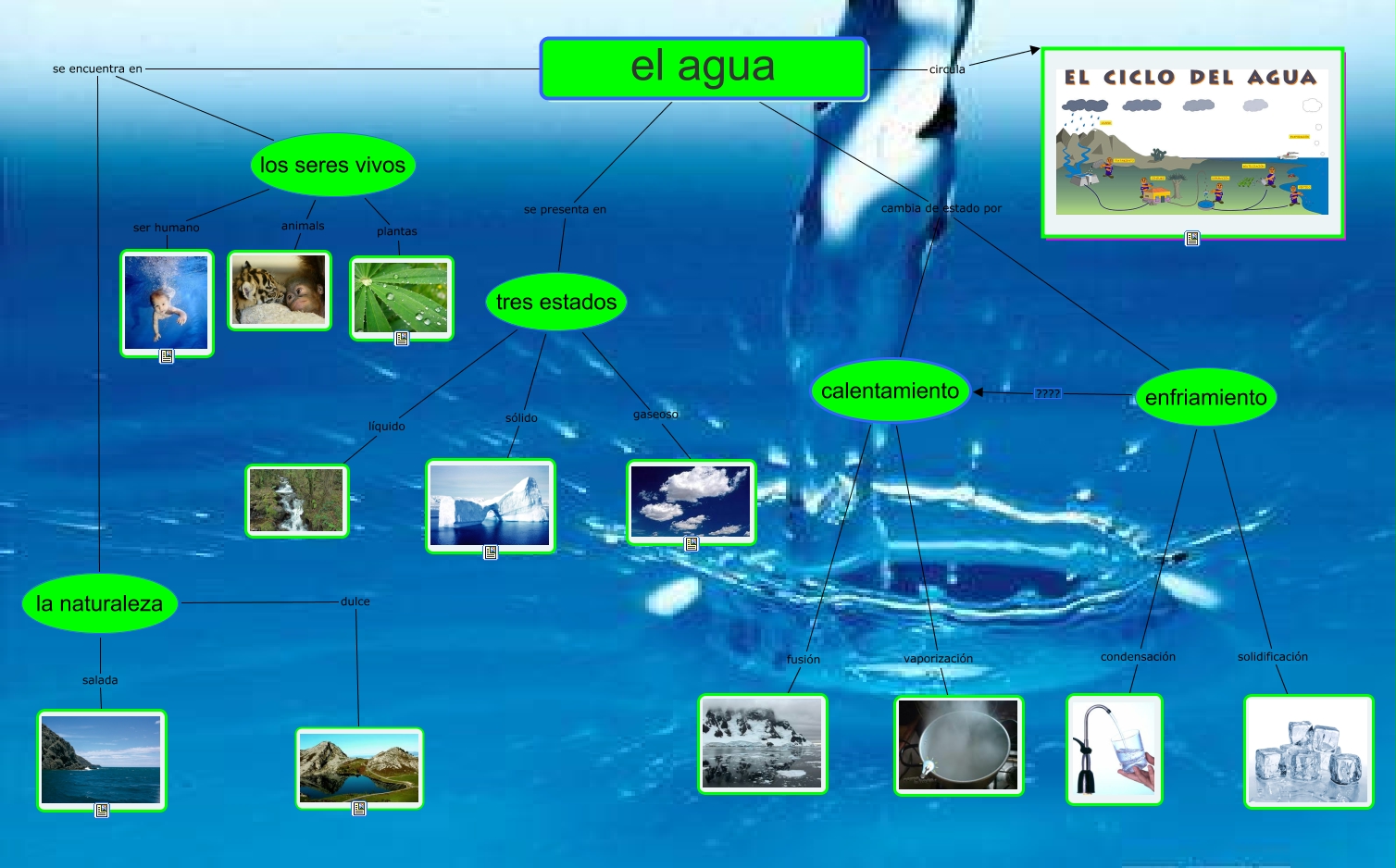 Aquest mapa conceptual conté informació relacionada amb: agua, enfriamiento ???? calentamiento, los seres vivos animals, enfriamiento condensación, la naturaleza dulce, el agua se presenta en tres estados, el agua se encuentra en los seres vivos, tres estados sólido, calentamiento vaporización, el agua se encuentra en la naturaleza, los seres vivos ser humano, los seres vivos plantas, el agua cambia de estado por calentamiento, calentamiento fusión, tres estados gaseoso, el agua cambia de estado por enfriamiento, el agua circula, tres estados líquido, enfriamiento solidificación, la naturaleza salada