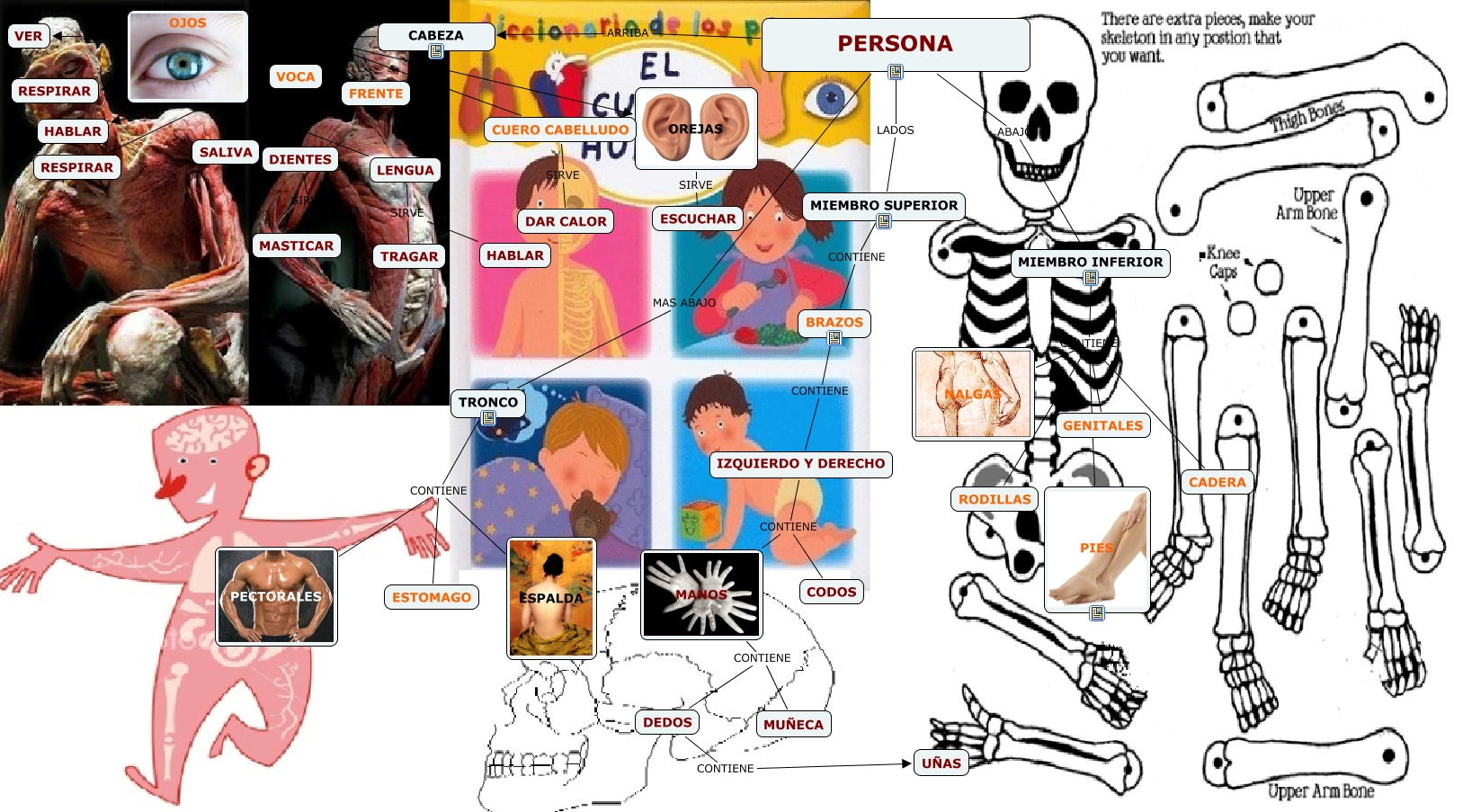 Este Cmap, tiene información relacionada con: CUERPO HUMANO_AITOR_SANCHEZ_OLIVA, IZQUIERDO Y DERECHO CONTIENE MANOS, CABEZA CONTIENE FRENTE, PERSONA ARRIBA CABEZA, VOCA CONTIENE LENGUA, CABEZA CONTIENE VOCA, MIEMBRO INFERIOR CONTIENE CADERA, BRAZOS CONTIENE IZQUIERDO Y DERECHO, CABEZA CONTIENE CUERO CABELLUDO, OREJAS SIRVE ESCUCHAR, MIEMBRO SUPERIOR CONTIENE BRAZOS, LENGUA SIRVE TRAGAR, DEDOS CONTIENE UÑAS, MIEMBRO INFERIOR CONTIENE NALGAS, CUERO CABELLUDO SIRVE DAR CALOR, MANOS CONTIENE DEDOS, LENGUA SIRVE HABLAR, MANOS CONTIENE MUÑECA, VOCA SIRVE RESPIRAR, PERSONA MAS ABAJO TRONCO, DIENTES SIRVE MASTICAR