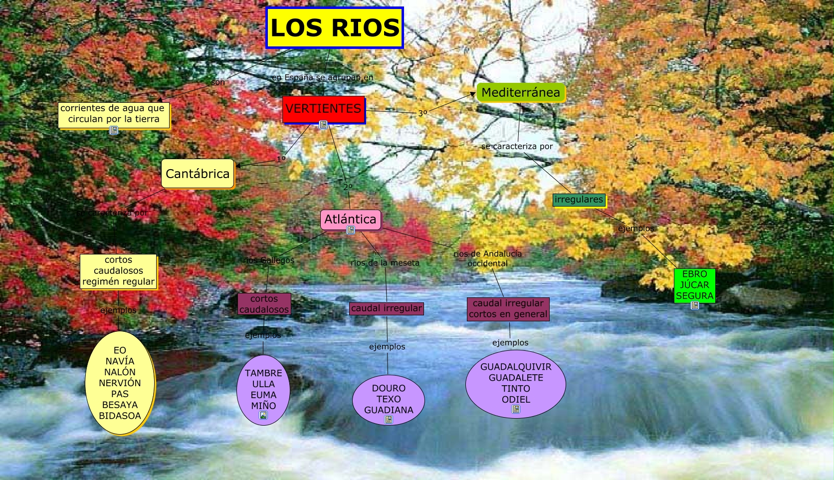 Este Cmap, tiene información relacionada con: rios de España, cortos caudalosos ejemplos TAMBRE ULLA EUMA MIÑO, irregulares ejemplos EBRO JÚCAR SEGURA, Cantábrica se caracteriza por cortos caudalosos regimén regular, Mediterránea se caracteriza por irregulares, caudal irregular ejemplos DOURO TEXO GUADIANA, LOS RIOS en España se agrupan en VERTIENTES, LOS RIOS son corrientes de agua que circulan por la tierra, Atlántica rios Gallegos cortos caudalosos, Atlántica rios de Andalucía occidental caudal irregular cortos en general, caudal irregular cortos en general ejemplos GUADALQUIVIR GUADALETE TINTO ODIEL, VERTIENTES 1º Cantábrica, VERTIENTES 3º Mediterránea, cortos caudalosos regimén regular ejemplos EO NAVÍA NALÓN NERVIÓN PAS BESAYA BIDASOA, VERTIENTES 2º Atlántica, Atlántica rios de la meseta caudal irregular