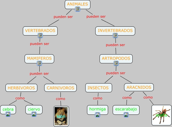 Este Cmap, tiene información relacionada con: clases de animales, ARACNIDOS como araña, ARACNIDOS como escarabajo, ANIMALES pueden ser VERTEBRADOS, VERTEBRADOS pueden ser MAMIFEROS, INVERTEBRADOS pueden ser ARTROPODOS, ANIMALES pueden ser INVERTEBRADOS, MAMIFEROS pueden ser HERBIVOROS, ARTROPODOS pueden ser INSECTOS, INSECTOS como hormiga, CARNIVOROS como león, HERBIVOROS como cebra, HERBIVOROS como ciervo, ARTROPODOS pueden ser ARACNIDOS, MAMIFEROS pueden ser CARNIVOROS