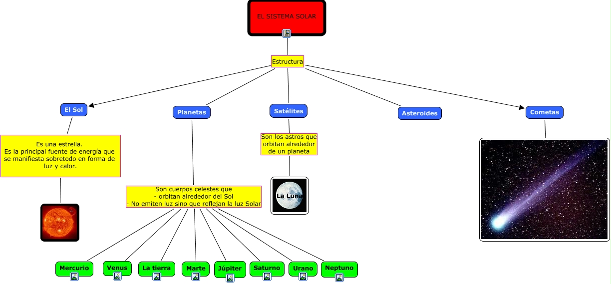 Aquest mapa conceptual conté informació relacionada amb: El sistema Solar_Daniel_Soldevila, Planetas Son cuerpos celestes que - orbitan alrededor del Sol - No emiten luz sino que reflejan la luz Solar Urano, Cometas ????, EL SISTEMA SOLAR Estructura Cometas, Satélites Son los astros que orbitan alrededor de un planeta La Luna, EL SISTEMA SOLAR Estructura El Sol, Planetas Son cuerpos celestes que - orbitan alrededor del Sol - No emiten luz sino que reflejan la luz Solar Júpiter, El Sol Es una estrella. Es la principal fuente de energía que se manifiesta sobretodo en forma de luz y calor., Planetas Son cuerpos celestes que - orbitan alrededor del Sol - No emiten luz sino que reflejan la luz Solar Saturno, Planetas Son cuerpos celestes que - orbitan alrededor del Sol - No emiten luz sino que reflejan la luz Solar Neptuno, Planetas Son cuerpos celestes que - orbitan alrededor del Sol - No emiten luz sino que reflejan la luz Solar Marte, Planetas Son cuerpos celestes que - orbitan alrededor del Sol - No emiten luz sino que reflejan la luz Solar Venus, EL SISTEMA SOLAR Estructura Asteroides, Planetas Son cuerpos celestes que - orbitan alrededor del Sol - No emiten luz sino que reflejan la luz Solar La tierra, Planetas Son cuerpos celestes que - orbitan alrededor del Sol - No emiten luz sino que reflejan la luz Solar Mercurio, EL SISTEMA SOLAR Estructura Satélites, EL SISTEMA SOLAR Estructura Planetas