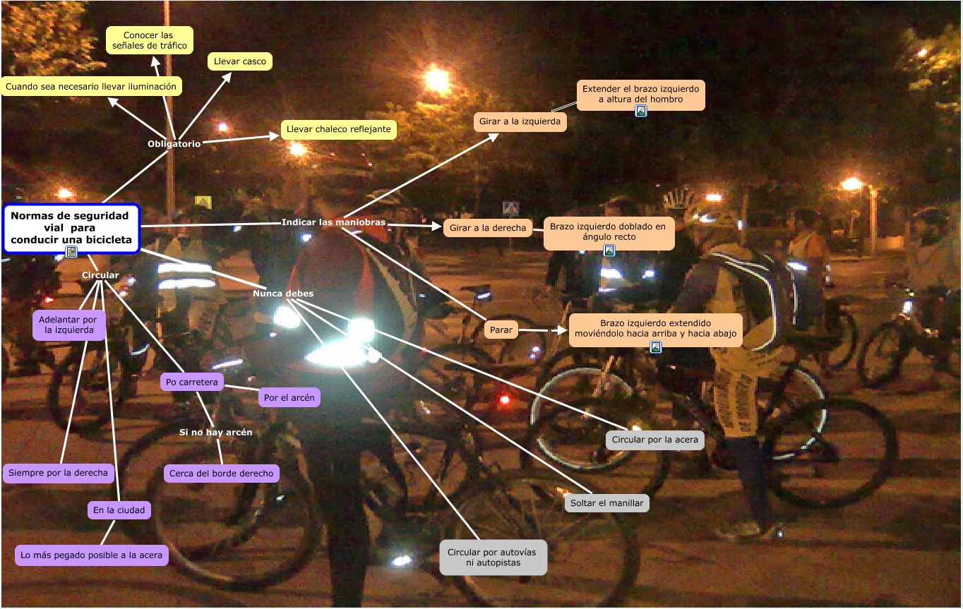 Este Cmap, tiene información relacionada con: Bicicletas 2, Po carretera Si no hay arcén Cerca del borde derecho, Normas de seguridad vial para conducir una bicicleta Obligatorio Llevar chaleco reflejante, Normas de seguridad vial para conducir una bicicleta Obligatorio Cuando sea necesario llevar iluminación, En la ciudad ???? Lo más pegado posible a la acera, Normas de seguridad vial para conducir una bicicleta Obligatorio Conocer las señales de tráfico, Po carretera Por el arcén, Normas de seguridad vial para conducir una bicicleta Indicar las maniobras Parar, Normas de seguridad vial para conducir una bicicleta Obligatorio Llevar casco, Parar Brazo izquierdo extendido moviéndolo hacia arriba y hacia abajo, Normas de seguridad vial para conducir una bicicleta Circular Siempre por la derecha, Girar a la izquierda Extender el brazo izquierdo a altura del hombro, Normas de seguridad vial para conducir una bicicleta Circular En la ciudad, Normas de seguridad vial para conducir una bicicleta Circular Adelantar por la izquierda, Normas de seguridad vial para conducir una bicicleta Nunca debes Soltar el manillar, Girar a la izquierda Extender el brazo izquierdo a altura del hombro, Normas de seguridad vial para conducir una bicicleta Nunca debes Circular por la acera, Normas de seguridad vial para conducir una bicicleta Indicar las maniobras Girar a la derecha, Normas de seguridad vial para conducir una bicicleta Indicar las maniobras Girar a la izquierda, Normas de seguridad vial para conducir una bicicleta Circular Po carretera, Normas de seguridad vial para conducir una bicicleta Nunca debes Circular por autovías ni autopistas