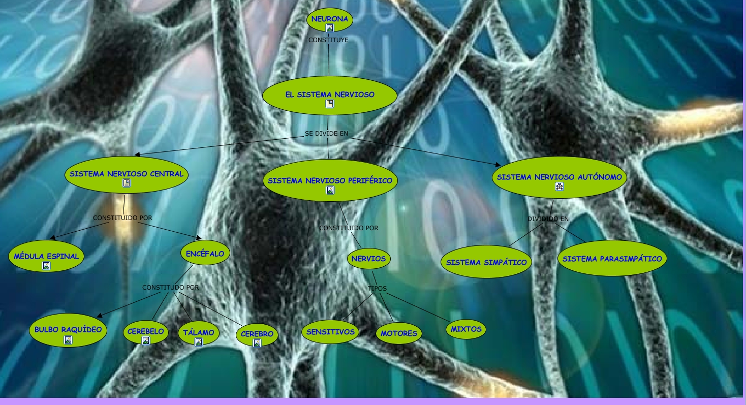 Este Cmap, tiene información relacionada con: SISTEMA NERVIOSO, EL SISTEMA NERVIOSO SE DIVIDE EN SISTEMA NERVIOSO AUTÓNOMO, ENCÉFALO CONSTITUDO POR CEREBRO, EL SISTEMA NERVIOSO SE DIVIDE EN SISTEMA NERVIOSO CENTRAL, ENCÉFALO CONSTITUDO POR BULBO RAQUÍDEO, ENCÉFALO CONSTITUDO POR CEREBELO, NEURONA CONSTITUYE EL SISTEMA NERVIOSO, SISTEMA NERVIOSO CENTRAL CONSTITUIDO POR ENCÉFALO, EL SISTEMA NERVIOSO SE DIVIDE EN SISTEMA NERVIOSO PERIFÉRICO, NERVIOS TIPOS MOTORES, NERVIOS TIPOS SENSITIVOS, ENCÉFALO CONSTITUDO POR TÁLAMO, SISTEMA NERVIOSO AUTÓNOMO DIVIDIDO EN SISTEMA SIMPÁTICO, NERVIOS TIPOS MIXTOS, SISTEMA NERVIOSO AUTÓNOMO DIVIDIDO EN SISTEMA PARASIMPÁTICO, SISTEMA NERVIOSO PERIFÉRICO CONSTITUIDO POR NERVIOS, SISTEMA NERVIOSO CENTRAL CONSTITUIDO POR MÉDULA ESPINAL