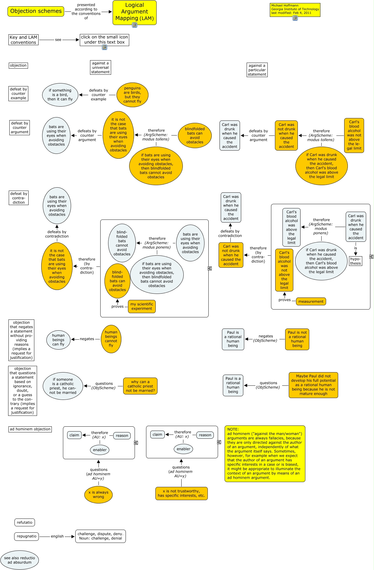 This Concept Map, created with IHMC CmapTools, has information related to: objection-schemes-materials, Carl was not drunk when he caused the accident defeats by contradiction Carl was drunk when he caused the accident, ???? therefore (by contra- diction) Carl was not drunk when he caused the accident, measurement proves Carl's blood alcohol was not above the legal limit, bats are using their eyes when avoiding obstacles therefore (ArgScheme: modus ponens) blind- folded bats cannot avoid obstacles, it is not the case that bats are using their eyes when avoiding obstacles defeats by counter argument bats are using their eyes when avoiding obstacles, Carl was drunk when he caused the accident is hypo- thesis, Carl was drunk when he caused the accident therefore (ArgScheme: modus ponens) Carl's blood alcohol was above the legal limit, if Carl was drunk when he caused the accident, then Carl's blood alcohol was above the legal limit therefore (ArgScheme: modus ponens) Carl's blood alcohol was above the legal limit, blindfolded bats can avoid obstacles therefore (ArgScheme: modus tollens) it is not the case that bats are using their eyes when avoiding obstacles, x is not trustworthy, has specific interests, etc. questions (ad hominem AU=y) ????, enabler therefore (AU: x) claim, enabler therefore (AU: x) claim, my scientific experiment proves blind- folded bats can avoid obstacles, it is not the case that bats are using their eyes when avoiding obstacles defeats by contradiction bats are using their eyes when avoiding obstacles, if bats are using their eyes when avoiding obstacles, then blindfolded bats cannot avoid obstacles therefore (ArgScheme: modus ponens) blind- folded bats cannot avoid obstacles, Carl's blood alcohol was not above the le- gal limit therefore (ArgScheme: modus tollens) Carl was not drunk when he caused the accident, Carl was not drunk when he caused the accident defeats by counter argument Carl was drunk when he caused the accident, if bats are using their eyes when avoiding obstacles, then blindfolded bats cannot avoid obstacles therefore (ArgScheme: modus tollens) it is not the case that bats are using their eyes when avoiding obstacles, Paul is not a rational human being negates (ObjScheme) Paul is a rational human being, Key and LAM conventions see click on the small icon under this text box