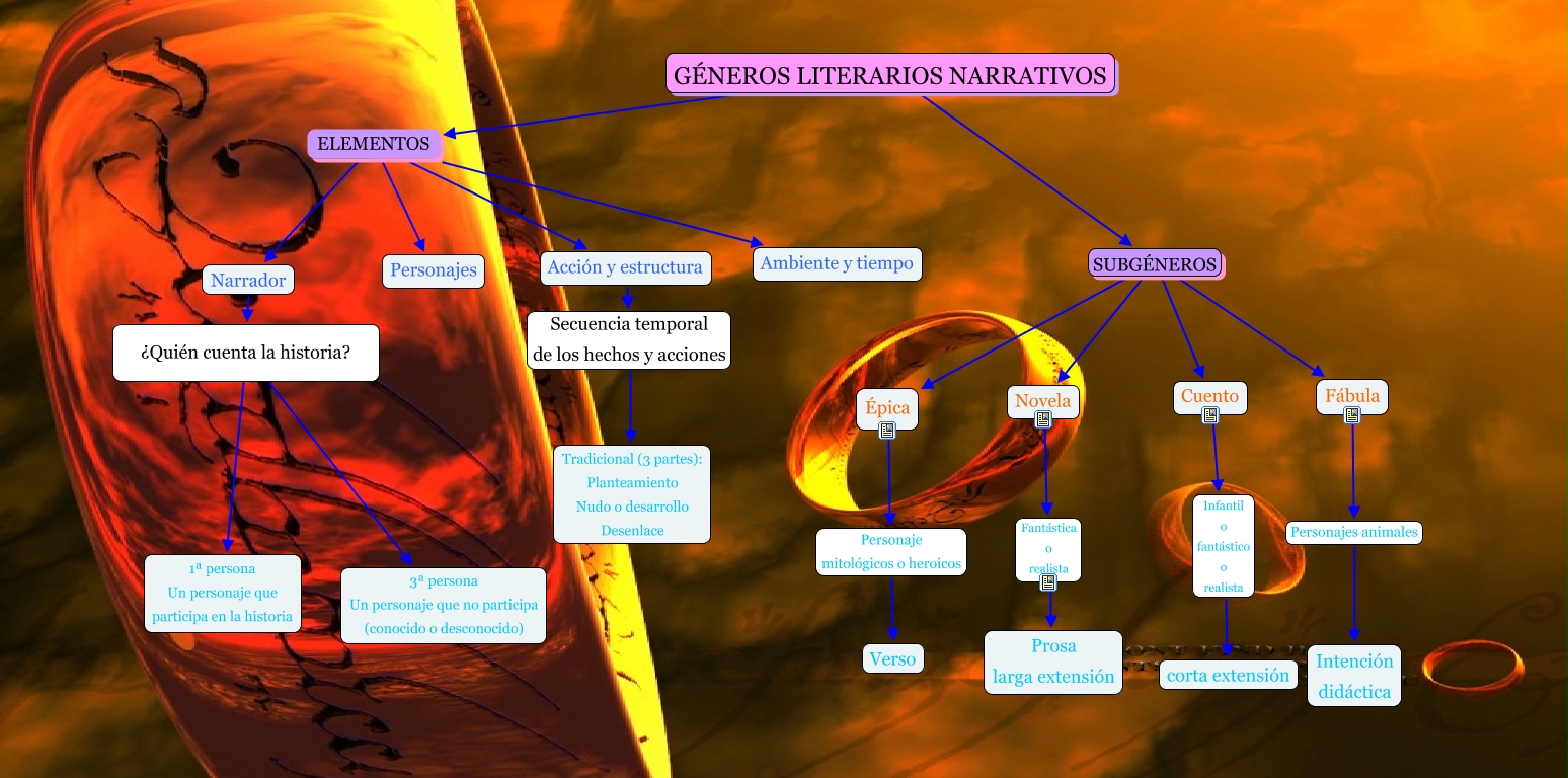 Este Cmap, tiene información relacionada con: géneros narrativos Mónica Bernabéu Maruenda webquest, GÉNEROS LITERARIOS NARRATIVOS ELEMENTOS Acción y estructura, Fábula Personajes animales Intención didáctica, GÉNEROS LITERARIOS NARRATIVOS SUBGÉNEROS Épica, Épica Personaje mitológicos o heroicos Verso, Novela Fantástica o realista Prosa larga extensión, GÉNEROS LITERARIOS NARRATIVOS ELEMENTOS Ambiente y tiempo, GÉNEROS LITERARIOS NARRATIVOS ELEMENTOS Narrador, GÉNEROS LITERARIOS NARRATIVOS ELEMENTOS Personajes, Cuento Infantil o fantástico o realista corta extensión, Acción y estructura Secuencia temporal de los hechos y acciones Tradicional (3 partes): Planteamiento Nudo o desarrollo Desenlace, GÉNEROS LITERARIOS NARRATIVOS SUBGÉNEROS Fábula, Narrador ¿Quién cuenta la historia? 3ª persona Un personaje que no participa (conocido o desconocido), GÉNEROS LITERARIOS NARRATIVOS SUBGÉNEROS Cuento, Narrador ¿Quién cuenta la historia? 1ª persona Un personaje que participa en la historia, GÉNEROS LITERARIOS NARRATIVOS SUBGÉNEROS Novela