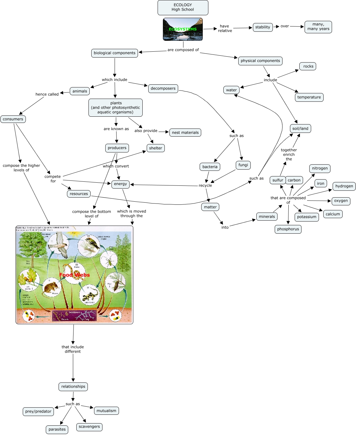 Este Cmap, tiene información relacionada con: Sin Título - What are ecosystems, consumers compete for shelter, physical components include soil/land, physical components include water, fungi recycle matter, consumers compete for energy, relationships such as mutualism, consumers compete for resources, biological components which include decomposers, ECOSYSTEMS have relative stability, minerals that are composed of oxygen, physical components include rocks, bacteria recycle matter, minerals that are composed of phosphorus, relationships such as prey/predator, biological components which include animals, producers compose the bottom level of Food Webs, minerals that are composed of potassium, decomposers such as fungi, Food Webs that include different relationships, plants (and other photosynthetic aquatic organisms) are known as producers