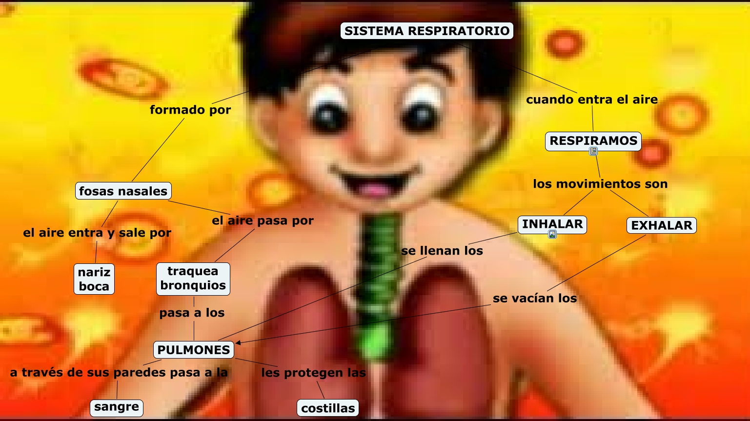 Este Cmap, tiene información relacionada con: SISTEMA RESPIRATORIO, SISTEMA RESPIRATORIO formado por fosas nasales, traquea bronquios pasa a los PULMONES, PULMONES les protegen las costillas, INHALAR se llenan los PULMONES, fosas nasales el aire entra y sale por nariz boca, SISTEMA RESPIRATORIO cuando entra el aire RESPIRAMOS, RESPIRAMOS los movimientos son INHALAR, fosas nasales el aire pasa por traquea bronquios, RESPIRAMOS los movimientos son EXHALAR, EXHALAR se vacían los PULMONES, PULMONES a través de sus paredes pasa a la sangre
