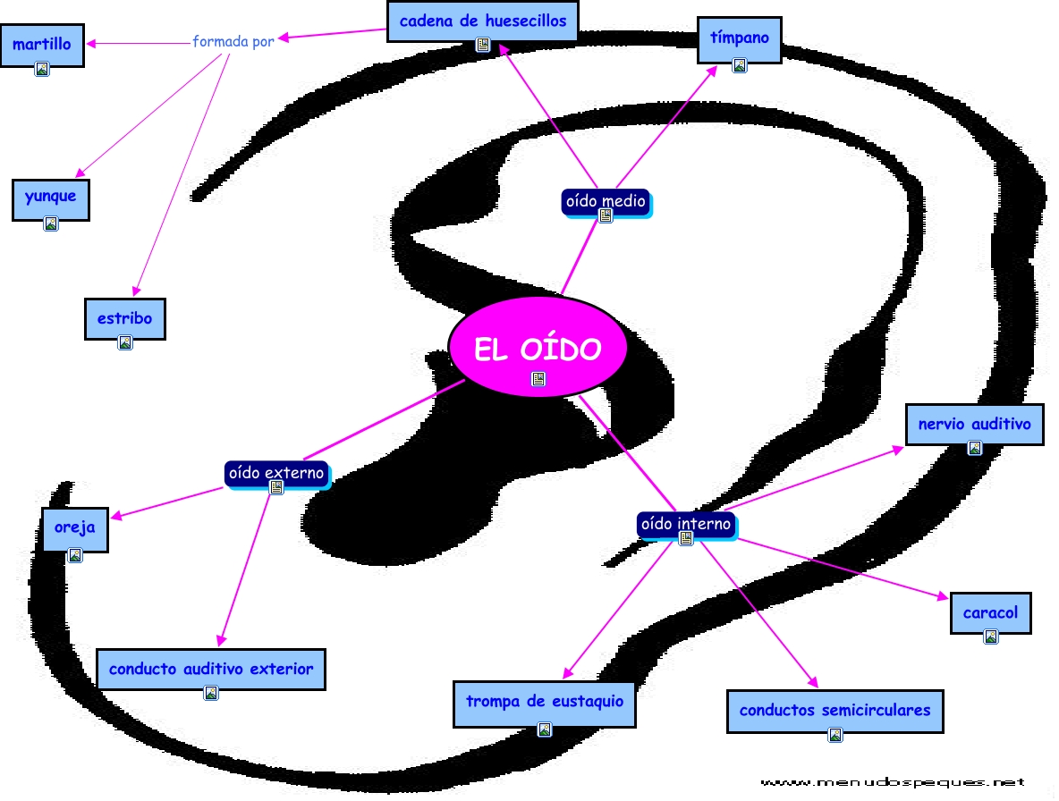 Este Cmap, tiene información relacionada con: El oído, EL OÍDO oído interno nervio auditivo, cadena de huesecillos formada por martillo, EL OÍDO oído medio cadena de huesecillos, EL OÍDO oído medio tímpano, cadena de huesecillos formada por yunque, cadena de huesecillos formada por estribo, EL OÍDO oído interno trompa de eustaquio, EL OÍDO oído externo oreja, EL OÍDO oído externo conducto auditivo exterior, EL OÍDO oído interno caracol, EL OÍDO oído interno conductos semicirculares