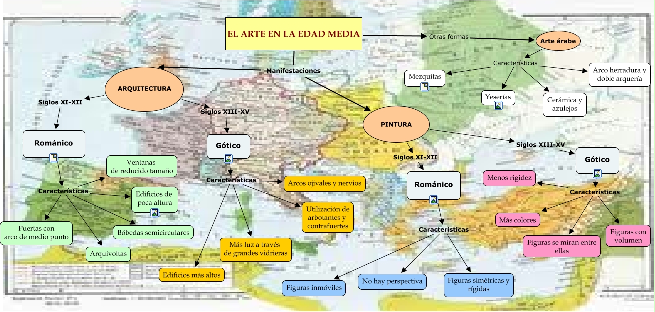 Este Cmap, tiene información relacionada con: social edad media, Románico Características Bóbedas semicirculares, Románico Características Figuras simétricas y rígidas, EL ARTE EN LA EDAD MEDIA Manifestaciones ARQUITECTURA, Gótico Características Figuras con volumen, PINTURA Siglos XIII-XV Gótico, Gótico Características Menos rigidez, Arte árabe Características Arco herradura y doble arquería, Románico Características Edificios de poca altura, Románico Características Figuras inmóviles, Arte árabe Características Cerámica y azulejos, Gótico Características Utilización de arbotantes y contrafuertes, Gótico Características Edificios más altos, EL ARTE EN LA EDAD MEDIA Manifestaciones PINTURA, Arte árabe Características Yeserías, Arte árabe Características Mezquitas, ARQUITECTURA Siglos XI-XII Románico, Románico Características Arquivoltas, Románico Características No hay perspectiva, Románico Características Ventanas de reducido tamaño, Gótico Características Más colores