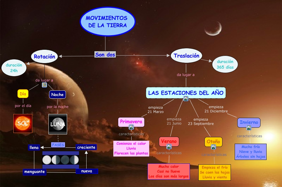 Este Cmap, tiene información relacionada con: El movimiento de la Tierra y las estaciones del año2, Traslación da lugar a LAS ESTACIONES DEL AÑO, menguante ???? creciente, Día por el día SOL, llena ???? menguante, MOVIMIENTOS DE LA TIERRA ???? Son dos, Rotación ???? duración 24h, menguante ???? nueva, Otoño características Empieza el frío Se caen las hojas Lluvia y viento, LAS ESTACIONES DEL AÑO empieza 21 Marzo Primavera, Son dos ???? Rotación, Rotación da lugar a Día, LAS ESTACIONES DEL AÑO empieza 21 Junio Verano, LAS ESTACIONES DEL AÑO empieza 21 Diciembre Invierno, LAS ESTACIONES DEL AÑO empieza 23 Septiembre Otoño, Invierno características Mucho frío Nieve y lluvia Árboles sin hojas, Son dos ???? Traslación, Noche por la noche LUNA, LUNA ???? FASES, Primavera características Comienza el calor Lluvia Florecen las plantas, Traslación ???? duración 365 días
