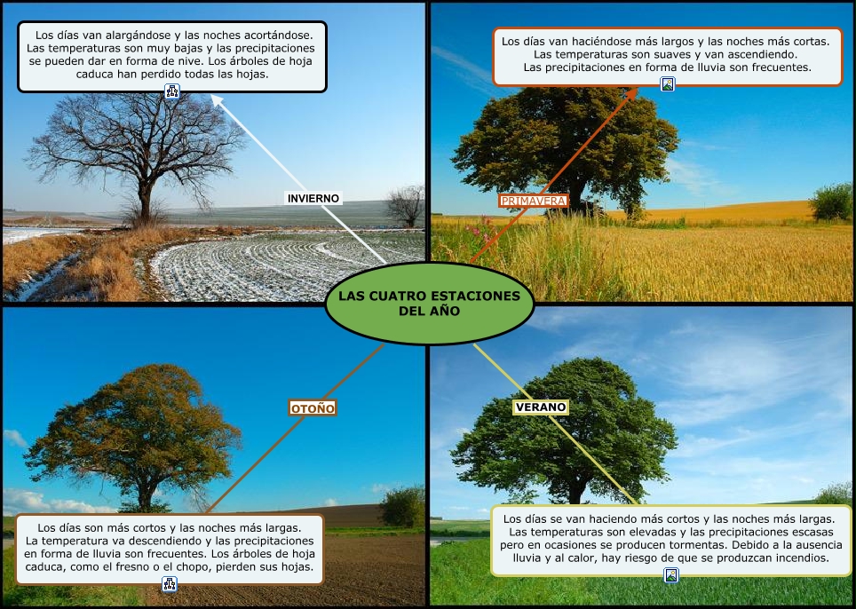Este Cmap, tiene información relacionada con: Jesús Óscar Molina, las cuatro estaciones, LAS CUATRO ESTACIONES DEL AÑO PRIMAVERA Los días van haciéndose más largos y las noches más cortas. Las temperaturas son suaves y van ascendiendo. Las precipitaciones en forma de lluvia son frecuentes., LAS CUATRO ESTACIONES DEL AÑO INVIERNO Los días van alargándose y las noches acortándose. Las temperaturas son muy bajas y las precipitaciones se pueden dar en forma de nive. Los árboles de hoja caduca han perdido todas las hojas., LAS CUATRO ESTACIONES DEL AÑO OTOÑO Los días son más cortos y las noches más largas. La temperatura va descendiendo y las precipitaciones en forma de lluvia son frecuentes. Los árboles de hoja caduca, como el fresno o el chopo, pierden sus hojas., LAS CUATRO ESTACIONES DEL AÑO VERANO Los días se van haciendo más cortos y las noches más largas. Las temperaturas son elevadas y las precipitaciones escasas pero en ocasiones se producen tormentas. Debido a la ausencia lluvia y al calor, hay riesgo de que se produzcan incendios.