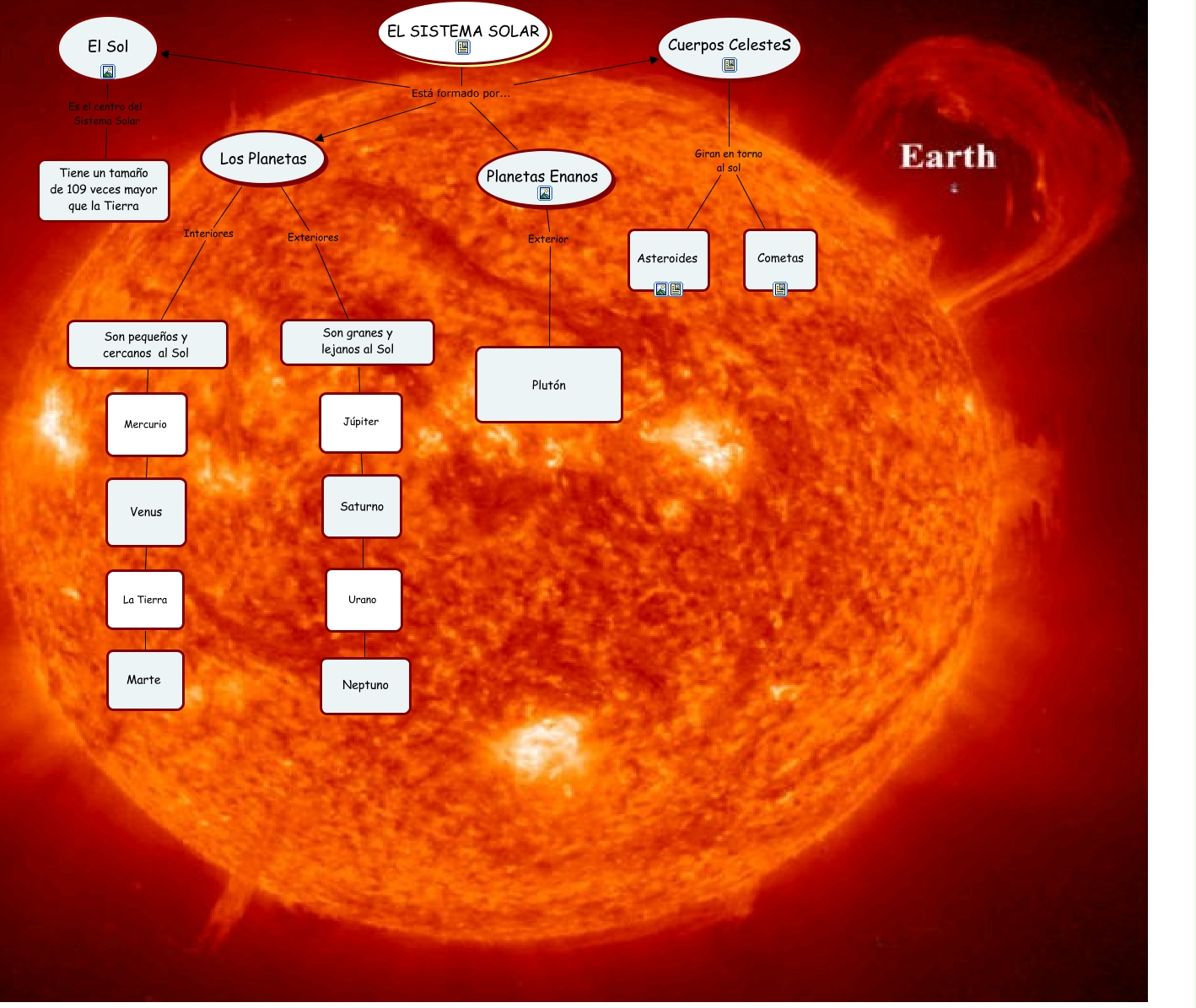 Este Cmap, tiene información relacionada con: El Sistema Solar, EL SISTEMA SOLAR Está formado por... El Sol, Cuerpos Celestes Giran en torno al sol Cometas, Saturno Urano Neptuno, EL SISTEMA SOLAR Está formado por... Cuerpos Celestes, EL SISTEMA SOLAR Está formado por... Planetas Enanos, El Sol Es el centro del Sistema Solar Tiene un tamaño de 109 veces mayor que la Tierra, Planetas Enanos Exterior Plutón, Son granes y lejanos al Sol Júpiter Saturno, Son pequeños y cercanos al Sol Mercurio Venus, Los Planetas Interiores Son pequeños y cercanos al Sol, Venus La Tierra Marte, Los Planetas Exteriores Son granes y lejanos al Sol, EL SISTEMA SOLAR Está formado por... Los Planetas, Cuerpos Celestes Giran en torno al sol Asteroides
