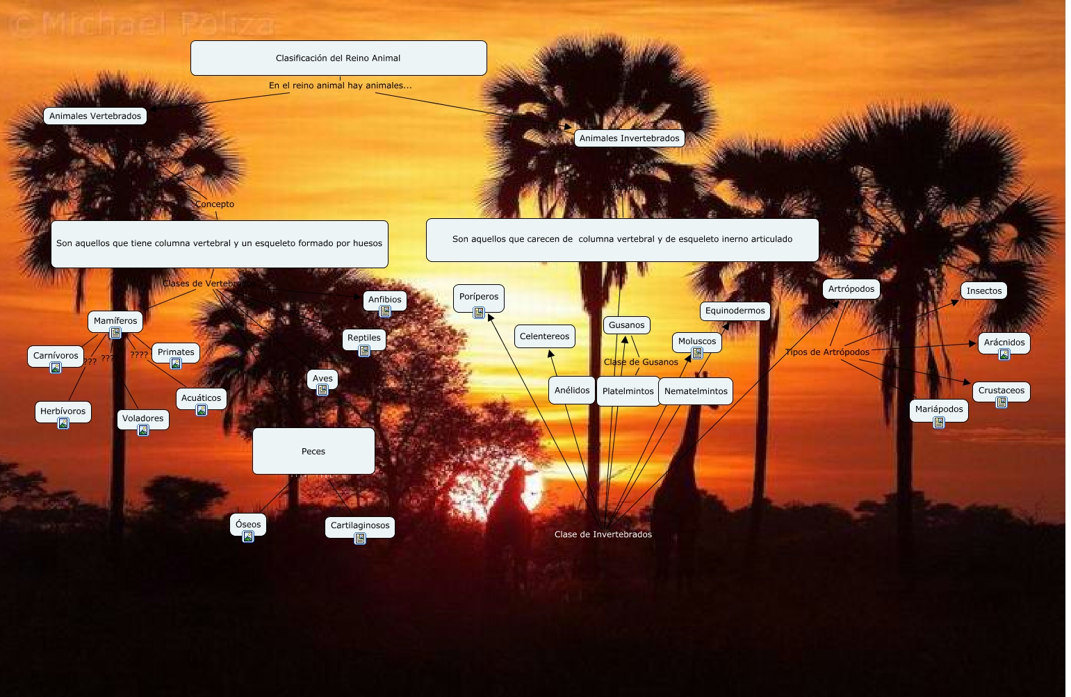 Este Cmap, tiene información relacionada con: El Reino Animal, Clasificación del Reino Animal En el reino animal hay animales... Animales Invertebrados, Gusanos Clase de Gusanos Platelmintos, Son aquellos que carecen de columna vertebral y de esqueleto inerno articulado Clase de Invertebrados Celentereos, Son aquellos que carecen de columna vertebral y de esqueleto inerno articulado Clase de Invertebrados Poríperos, Artrópodos Tipos de Artrópodos Crustaceos, Artrópodos Tipos de Artrópodos Arácnidos, Mamíferos ???? Carnívoros, Platelmintos ???? Anélidos, Son aquellos que carecen de columna vertebral y de esqueleto inerno articulado Clase de Invertebrados Moluscos, Animales Invertebrados Concepto Son aquellos que carecen de columna vertebral y de esqueleto inerno articulado, Son aquellos que tiene columna vertebral y un esqueleto formado por huesos Clases de Vertebrados Reptiles, Son aquellos que tiene columna vertebral y un esqueleto formado por huesos Clases de Vertebrados Aves, Platelmintos ???? Nematelmintos, Mamíferos ???? Primates, Animales Vertebrados Concepto Son aquellos que tiene columna vertebral y un esqueleto formado por huesos, Mamíferos ???? Acuáticos, Peces ???? Óseos, Son aquellos que carecen de columna vertebral y de esqueleto inerno articulado Clase de Invertebrados Gusanos, Peces ???? Cartilaginosos, Mamíferos ???? Voladores