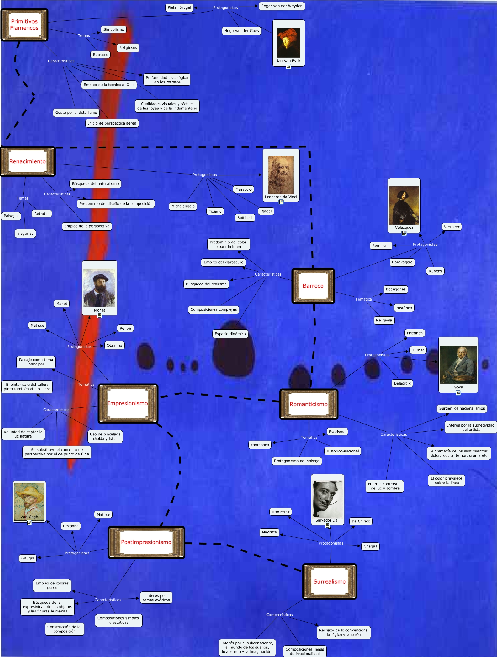 Este Cmap, tiene información relacionada con: maparte, Surrealismo Protagonistas Chagall, Renacimiento Barroco, Impresionismo Protagonistas Monet, Impresionismo Características Se substituye el concepto de perspectiva por el de punto de fuga, Primitivos Flamencos Temas Simbolismo, Barroco Temática Bodegones, Renacimiento Temas Paisajes, Renacimiento Protagonistas Rafael, Barroco Características Búsqueda del realismo, Primitivos Flamencos Características Cualidades visuales y táctiles de las joyas y de la indumentaria, Impresionismo Protagonistas Matisse, Primitivos Flamencos Características Gusto por el detallismo, Surrealismo Protagonistas Salvador Dalí, Surrealismo Características Composiciones llenas de irracionalidad, Renacimiento Características Empleo de la perspectiva, Romanticismo Características Surgen los nacionalismos, Romanticismo Impresionismo, Impresionismo Protagonistas Manet, Renacimiento Temas Retratos, Barroco Protagonistas Velázquez