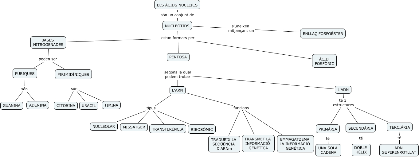 Este Cmap, tiene información relacionada con: ELS ÀCIDS NUCLEICS, L'ARN tipus NUCLEOLAR, BASES NITROGENADES poden ser PIRIMIDÍNIQUES, L'ARN tipus RIBOSÒMIC, PÚRIQUES són GUANINA, PIRIMIDÍNIQUES són CITOSINA, L'ARN tipus MISSATGER, L'ADN té 3 estructures PRIMÀRIA, L'ARN tipus TRANSFERÈNCIA, PRIMÀRIA té UNA SOLA CADENA, L'ADN té 3 estructures TERCIÀRIA, L'ARN funcions EMMAGATZEMA LA INFORMACIÓ GENÈTICA, ELS ÀCIDS NUCLEICS són un conjunt de NUCLEÒTIDS, L'ARN funcions TRANSMET LA INFORMACIÓ GENÈTICA, PENTOSA segons la qual podem trobar L'ADN, NUCLEÒTIDS s'uneixen mitjançant un ENLLAÇ FOSFOÈSTER, L'ARN funcions TRADUEIX LA SEQÜÈNCIA D'ARNm, SECUNDÀRIA té DOBLE HÈLIX, PÚRIQUES són ADENINA, L'ADN té 3 estructures SECUNDÀRIA, NUCLEÒTIDS estan formats per PENTOSA