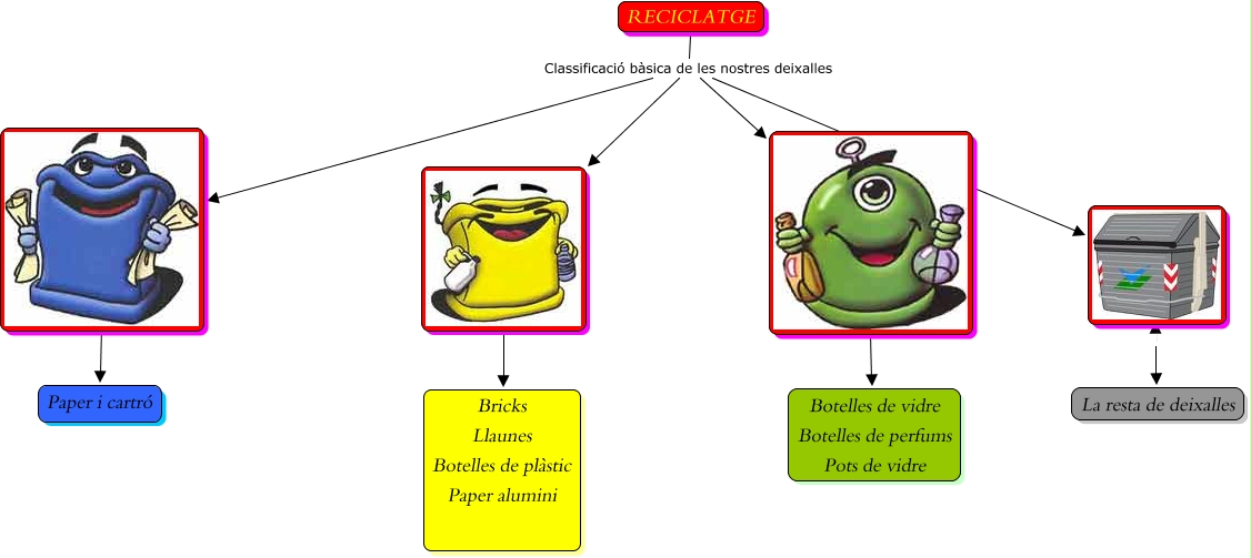 Este Cmap, tiene información relacionada con: Reciclatge, ???? Paper i cartró, RECICLATGE Classificació bàsica de les nostres deixalles, RECICLATGE Classificació bàsica de les nostres deixalles, RECICLATGE Classificació bàsica de les nostres deixalles, ???? Botelles de vidre Botelles de perfums Pots de vidre, La resta de deixalles, ???? Bricks Llaunes Botelles de plàstic Paper alumini, RECICLATGE Classificació bàsica de les nostres deixalles