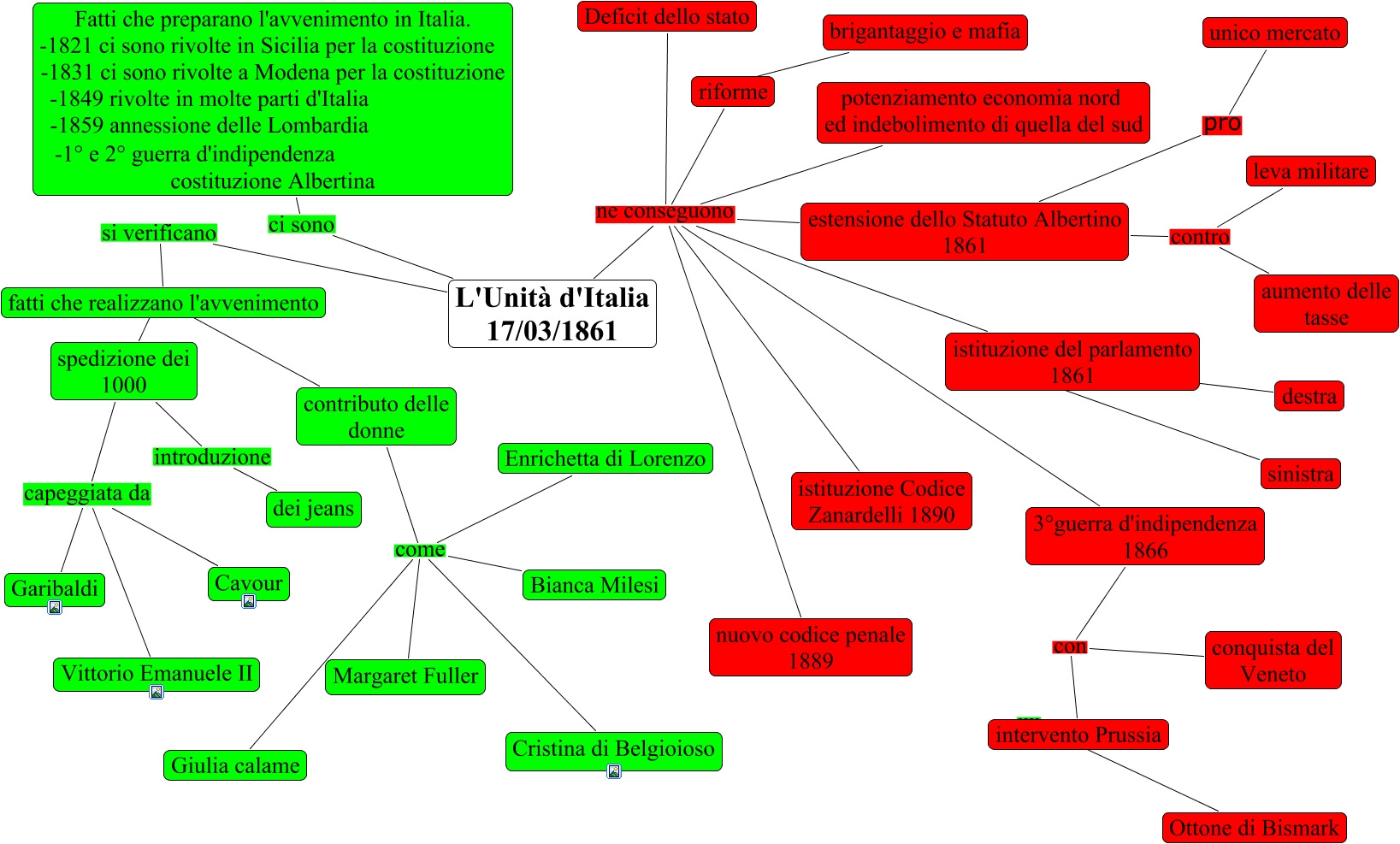 Questa Cmap, creata con IHMC CmapTools, contiene informazioni relative a: L'UNITà D'ITALIA DEL CARTELLONE, L'Unità d'Italia 17/03/1861 ne conseguono Deficit dello stato, contributo delle donne come Bianca Milesi, L'Unità d'Italia 17/03/1861 ne conseguono riforme, L'Unità d'Italia 17/03/1861 ne conseguono estensione dello Statuto Albertino 1861, contributo delle donne come Enrichetta di Lorenzo, fatti che realizzano l'avvenimento ???? contributo delle donne, estensione dello Statuto Albertino 1861 pro unico mercato, istituzione del parlamento 1861 ???? destra, contributo delle donne come Cristina di Belgioioso, fatti che realizzano l'avvenimento ???? spedizione dei 1000, spedizione dei 1000 introduzione dei jeans, contributo delle donne come Margaret Fuller, spedizione dei 1000 capeggiata da Vittorio Emanuele II, istituzione del parlamento 1861 ???? sinistra, L'Unità d'Italia 17/03/1861 si verificano fatti che realizzano l'avvenimento, L'Unità d'Italia 17/03/1861 ci sono Fatti che preparano l'avvenimento in Italia. -1821 ci sono rivolte in Sicilia per la costituzione -1831 ci sono rivolte a Modena per la costituzione -1849 rivolte in molte parti d'Italia -1859 annessione delle Lombardia -1° e 2° guerra d'indipendenza costituzione Albertina, L'Unità d'Italia 17/03/1861 ne conseguono istituzione Codice Zanardelli 1890, riforme ???? brigantaggio e mafia, estensione dello Statuto Albertino 1861 contro leva militare, L'Unità d'Italia 17/03/1861 ne conseguono 3°guerra d'indipendenza 1866
