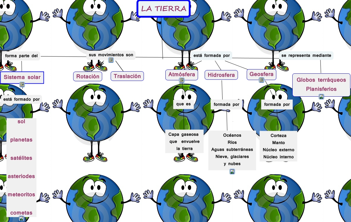 Este Cmap, tiene información relacionada con: La tierra, está formada por ???? Geosfera, Océanos Ríos Aguas subterráneas Nieve, glaciares y nubes ???? formada por, sus movimientos son ???? Traslación, Rotación ???? sus movimientos son, se representa mediante ???? forma parte del, está formada por ???? Hidrosfera, que es ???? Atmósfera, Hidrosfera ???? formada por, Geosfera ???? formada por, Capa gaseosa que envuelve la tierra ???? que es, Sistema solar ???? está formado por, se representa mediante ???? Globos terráqueos Planisferios, sus movimientos son ???? Traslación, Corteza Manto Núcleo externo Núcleo interno ???? formada por, LA TIERRA ????, Sistema solar ???? forma parte del, Atmósfera ???? está formada por, está formado por ???? sol planetas satélites asteriodes meteoritos cometas