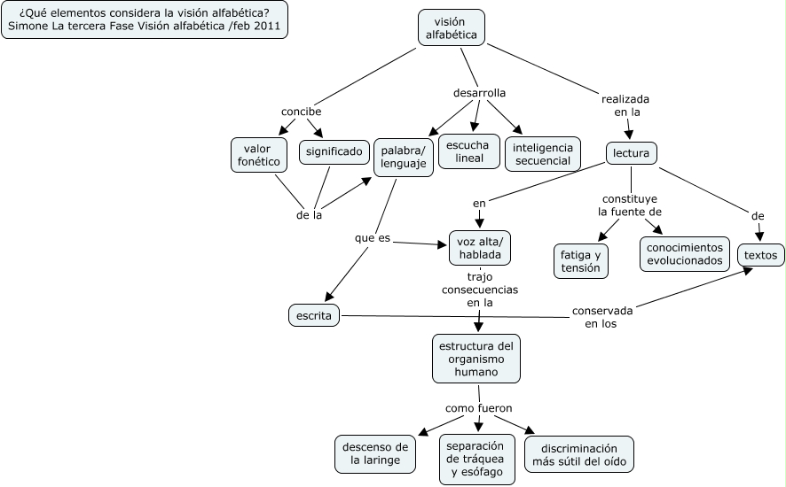 Este Cmap, tiene información relacionada con: Simone La tercera Fase visión alfabética, palabra/ lenguaje que es voz alta/ hablada, escrita conservada en los textos, voz alta/ hablada trajo consecuencias en la estructura del organismo humano, estructura del organismo humano como fueron discriminación más sútil del oído, lectura constituye la fuente de conocimientos evolucionados, palabra/ lenguaje que es escrita, visión alfabética desarrolla palabra/ lenguaje, visión alfabética desarrolla escucha lineal, valor fonético de la palabra/ lenguaje, lectura en voz alta/ hablada, visión alfabética concibe significado, estructura del organismo humano como fueron descenso de la laringe, voz alta/ hablada trajo consecuencias en la estructura del organismo humano, significado de la palabra/ lenguaje, lectura de textos, visión alfabética desarrolla inteligencia secuencial, visión alfabética concibe valor fonético, estructura del organismo humano como fueron separación de tráquea y esófago, lectura constituye la fuente de fatiga y tensión, visión alfabética realizada en la lectura