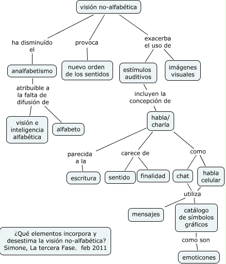 Este Cmap, tiene información relacionada con: Simone La tercera Fase visión no-alfabética, habla celular utiliza catálogo de símbolos gráficos, habla/ charla parecida a la escritura, analfabetismo atribuible a la falta de difusión de alfabeto, habla/ charla como habla celular, analfabetismo atribuible a la falta de difusión de visión e inteligencia alfabética, habla/ charla carece de sentido, chat utiliza catálogo de símbolos gráficos, visión no-alfabética exacerba el uso de estímulos auditivos, estímulos auditivos incluyen la concepción de habla/ charla, visión no-alfabética exacerba el uso de imágenes visuales, visión no-alfabética provoca nuevo orden de los sentidos, habla celular utiliza mensajes, catálogo de símbolos gráficos como son emoticones, visión no-alfabética ha disminuído el analfabetismo, habla/ charla como chat, habla/ charla carece de finalidad, chat utiliza mensajes
