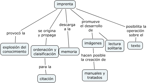 Este Cmap, tiene información relacionada con: Simone, La tercera Fase. La imprenta, imágenes hacen posible la creación de manuales y tratados, ordenación y claisificación para la citación, imprenta descarga a la memoria, imprenta provocó la explosión del conocimiento, imprenta posibilita la operación sobre el texto, imprenta se origina y propaga ordenación y claisificación, imprenta promueve el desarrollo de imágenes, imprenta promueve el desarrollo de lectura solitaria