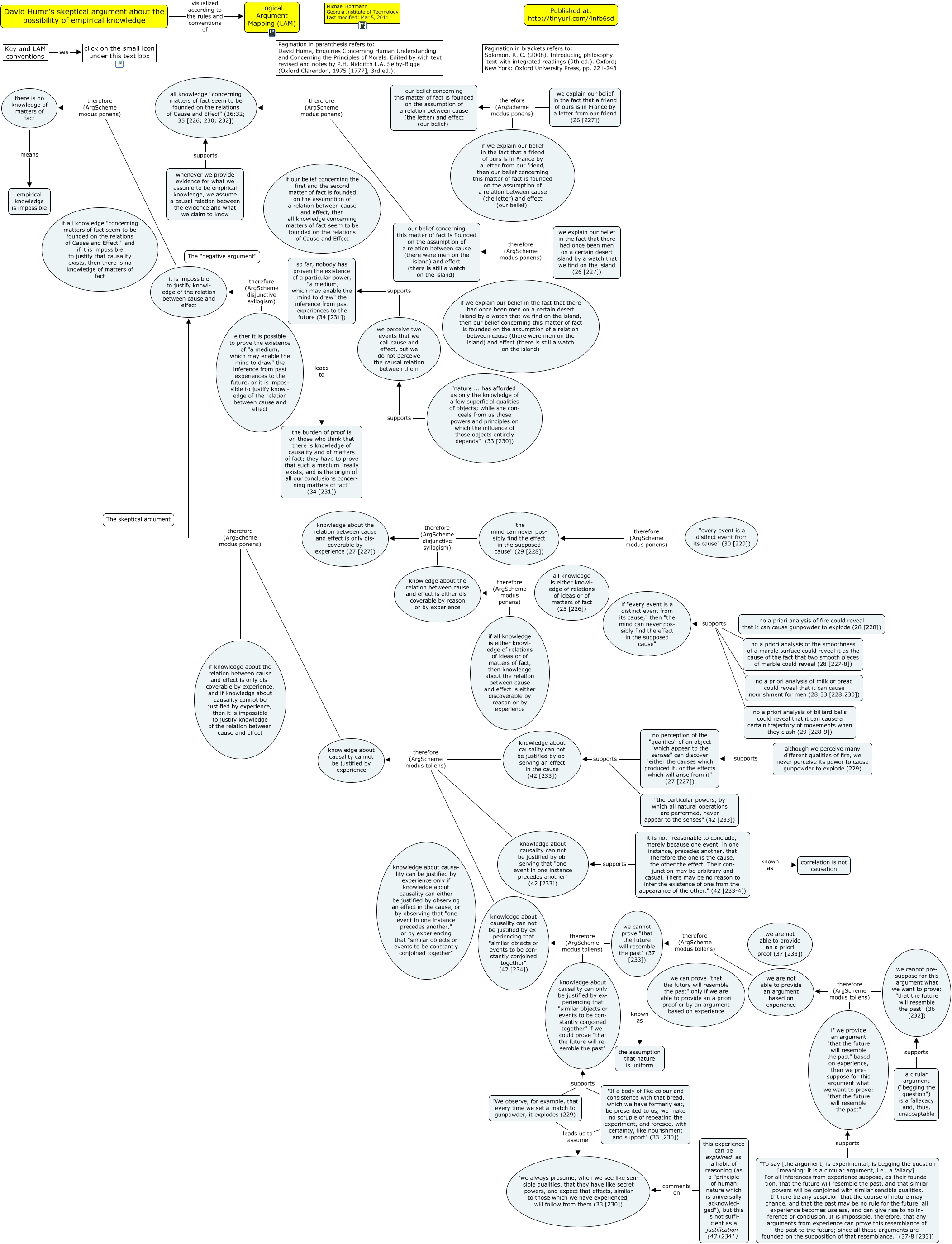 This Concept Map, created with IHMC CmapTools, has information related to: Hume-on-the-impossibility-to-justify-empirical-knowledge, our belief concerning this matter of fact is founded on the assumption of a relation between cause (there were men on the island) and effect (there is still a watch on the island) therefore (ArgScheme modus ponens) all knowledge "concerning matters of fact seem to be founded on the relations of Cause and Effect" (26;32; 35 [226; 230; 232]), we explain our belief in the fact that a friend of ours is in France by a letter from our friend (26 [227]) therefore (ArgScheme modus ponens) our belief concerning this matter of fact is founded on the assumption of a relation between cause (the letter) and effect (our belief), so far, nobody has proven the existence of a particular power, "a medium, which may enable the mind to draw" the inference from past experiences to the future (34 [231]) leads to the burden of proof is on those who think that there is knowledge of causality and of matters of fact; they have to prove that such a medium "really exists, and is the origin of all our conclusions concer- ning matters of fact" (34 [231]), "If a body of like colour and consistence with that bread, which we have formerly eat, be presented to us, we make no scruple of repeating the experiment, and foresee, with certainty, like nourishment and support" (33 [230]) leads us to assume "we always presume, when we see like sen- sible qualities, that they have like secret powers, and expect that effects, similar to those which we have experienced, will follow from them (33 [230]), "nature ... has afforded us only the knowledge of a few superficial qualities of objects; while she con- ceals from us those powers and principles on which the influence of those objects entirely depends" (33 [230]) supports we perceive two events that we call cause and effect, but we do not perceive the causal relation between them, there is no knowledge of matters of fact means empirical knowledge is impossible, if we provide an argument "that the future will resemble the past" based on experience, then we pre- suppose for this argument what we want to prove: "that the future will resemble the past" therefore (ArgScheme modus tollens) we are not able to provide an argument based on experience, we cannot prove "that the future will resemble the past" (37 [233]) therefore (ArgScheme modus tollens) knowledge about causality can not be justified by ex- periencing that "similar objects or events to be con- stantly conjoined together" (42 [234]), it is not "reasonable to conclude, merely because one event, in one instance, precedes another, that therefore the one is the cause, the other the effect. Their con- junction may be arbitrary and casual. There may be no reason to infer the existence of one from the appearance of the other." (42 [233-4]) known as correlation is not causation, knowledge about the relation between cause and effect is either dis- coverable by reason or by experience therefore (ArgScheme disjunctive syllogism) knowledge about the relation between cause and effect is only dis- coverable by experience (27 [227]), we can prove "that the future will resemble the past" only if we are able to provide an a priori proof or by an argument based on experience therefore (ArgScheme modus tollens) we cannot prove "that the future will resemble the past" (37 [233]), knowledge about causality cannot be justified by experience therefore (ArgScheme modus ponens) it is impossible to justify knowl- edge of the relation between cause and effect, no a priori analysis of billiard balls could reveal that it can cause a certain trajectory of movements when they clash (29 [228-9]) supports if "every event is a distinct event from its cause," then "the mind can never pos- sibly find the effect in the supposed cause", all knowledge is either knowl- edge of relations of ideas or of matters of fact (25 [226]) therefore (ArgScheme modus ponens) knowledge about the relation between cause and effect is either dis- coverable by reason or by experience, our belief concerning this matter of fact is founded on the assumption of a relation between cause (the letter) and effect (our belief) therefore (ArgScheme modus ponens) all knowledge "concerning matters of fact seem to be founded on the relations of Cause and Effect" (26;32; 35 [226; 230; 232]), we cannot pre- suppose for this argument what we want to prove: "that the future will resemble the past" (36 [232]) therefore (ArgScheme modus tollens) we are not able to provide an argument based on experience, "the particular powers, by which all natural operations are performed, never appear to the senses" (42 [233]) supports knowledge about causality can not be justified by ob- serving an effect in the cause (42 [233]), it is not "reasonable to conclude, merely because one event, in one instance, precedes another, that therefore the one is the cause, the other the effect. Their con- junction may be arbitrary and casual. There may be no reason to infer the existence of one from the appearance of the other." (42 [233-4]) supports knowledge about causality can not be justified by ob- serving that "one event in one instance precedes another" (42 [233]), knowledge about causality can not be justified by ob- serving that "one event in one instance precedes another" (42 [233]) therefore (ArgScheme modus tollens) knowledge about causality cannot be justified by experience, this experience can be explained as a habit of reasoning (as a "principle of human nature which is universally acknowled- ged"), but this is not suffi- cient as a justification (43 [234]) comments on "we always presume, when we see like sen- sible qualities, that they have like secret powers, and expect that effects, similar to those which we have experienced, will follow from them (33 [230])