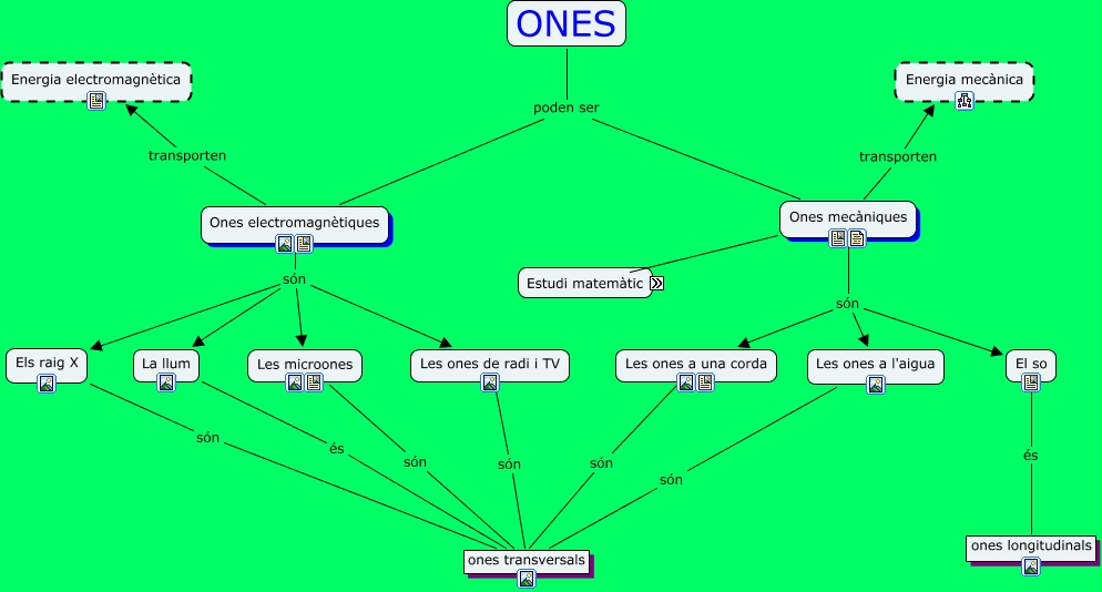 Aquest mapa conceptual conté informació relacionada amb: Tipus d'ones, Ones electromagnètiques transporten Energia electromagnètica, Les microones són ones transversals, Ones mecàniques Estudi matemàtic Ecuació d'0nes, Ones mecàniques són El so, Ones mecàniques Estudi matemàtic Velocitat de propagació, Les ones a una corda són ones transversals, Les ones a l'aigua són ones transversals, Ones electromagnètiques són La llum, Les ones de radi i TV són ones transversals, ONES poden ser Ones electromagnètiques, Els raig X són ones transversals, Ones electromagnètiques són Les microones, ONES poden ser Ones mecàniques, El so és ones longitudinals, Ones mecàniques són Les ones a una corda, La llum és ones transversals, Ones electromagnètiques són Les ones de radi i TV, Ones electromagnètiques són Els raig X, Ones mecàniques transporten Energia mecànica, Ones mecàniques són Les ones a l'aigua