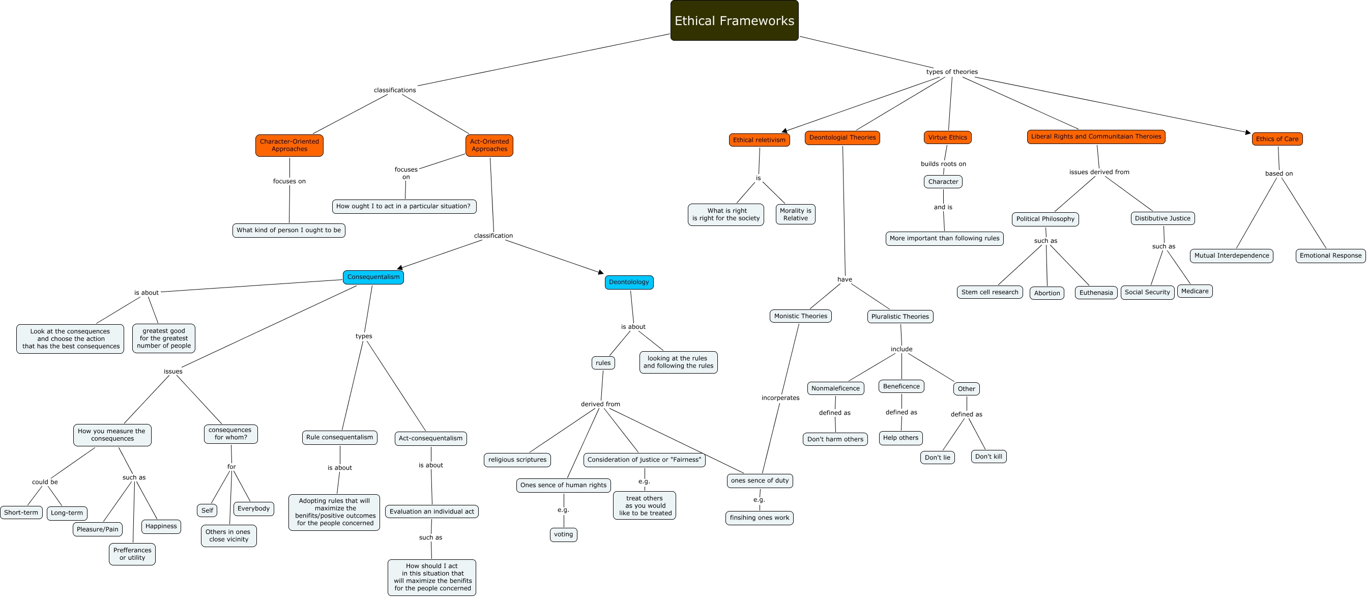 This Concept Map has information related to: Ethical Frameworks, Ethical Frameworks types of theories Deontologial Theories, Other defined as Don't kill, consequences for whom? for Others in ones close vicinity, Political Philosophy such as Euthenasia, How you measure the consequences such as Pleasure/Pain, Act-Oriented Approaches classification Consequentalism, consequences for whom? for Self, Ethical Frameworks classifications Act-Oriented Approaches, Nonmaleficence defined as Don't harm others, Deontolology is about rules