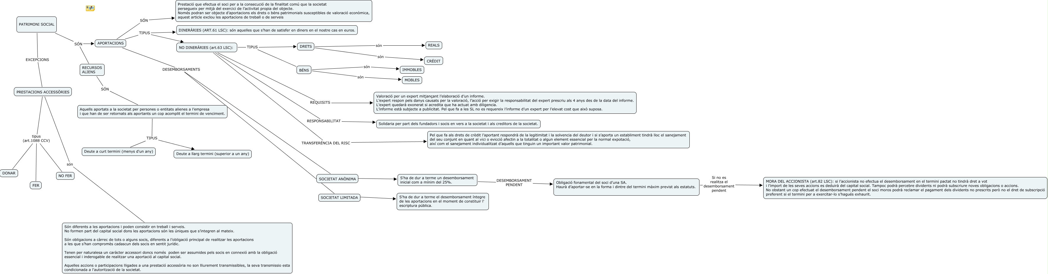 Aquest mapa conceptual conté informació relacionada amb: ESCENARI 2, Aquells aportats a la societat per persones o entitats alienes a l’empresa i que han de ser retornats als aportants un cop acomplit el termini de venciment. TIPUS Deute a curt termini (menys d'un any), APORTACIONS DESEMBORSAMENTS SOCIETAT LIMITADA, NO DINERÀRIES (art.63 LSC): REQUISITS Valoració per un expert mitjançant l’elaboració d’un informe. L’expert respon pels danys causats per la valoració, l’acció per exigir la responsabilitat del expert prescriu als 4 anys des de la data del informe. L’expert quedarà exonerat si acredita que ha actuat amb diligencia. L’informe està subjecte a publicitat. Pel que fa a les SL no es requereix l’informe d’un expert per l’elevat cost que això suposa., BÉNS són MOBLES, PATRIMONI SOCIAL SÓN RECURSOS ALIENS, DRETS són REALS, PRESTACIONS ACCESSÒRIES tipus (art.1088 CCV) FER, S'ha de dur a terme un desemborsament inicial com a mínim del 25%. DESEMBORSAMENT PENDENT Obligació fonamental del soci d’una SA. Haurà d’aportar-se en la forma i dintre del termini màxim previst als estatuts., DRETS són CRÉDIT, APORTACIONS SÓN Prestació que efectua el soci per a la consecució de la finalitat comú que la societat persegueix per mitjà del exercici de l’activitat propia del objecte. Només podran ser objecte d’aportacions els drets o béns patrimonials susceptibles de valoració econòmica, aquest article exclou les aportacions de treball o de serveis, APORTACIONS DESEMBORSAMENTS SOCIETAT ANÒNIMA, NO DINERÀRIES (art.63 LSC): TRANSFERÈNCIA DEL RISC Pel que fa als drets de crèdit l’aportant respondrà de la legitimitat i la solvencia del deutor i si s’aporta un establiment tindrà lloc el sanejament del seu conjunt en quant al vici o evicció afectin a la totalitat o algun element essencial per la normal expotació, així com el sanejament individualitzat d’aquells que tinguin un important valor patrimonial., PRESTACIONS ACCESSÒRIES tipus (art.1088 CCV) NO FER, Aquells aportats a la societat per persones o entitats alienes a l’empresa i que han de ser retornats als aportants un cop acomplit el termini de venciment. TIPUS Deute a llarg termini (superior a un any), NO DINERÀRIES (art.63 LSC): TIPUS BÉNS, NO DINERÀRIES (art.63 LSC): RESPONSABILITAT Solidaria per part dels fundadors i socis en vers a la societat i als creditors de la societat., APORTACIONS TIPUS NO DINERÀRIES (art.63 LSC):, PATRIMONI SOCIAL EXCEPCIONS PRESTACIONS ACCESSÒRIES, PATRIMONI SOCIAL SÓN APORTACIONS, SOCIETAT LIMITADA ???? S'ha de dur a terme el desemborsament íntegre de les aportacions en el moment de constituir l' escriptura pública.
