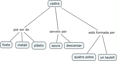 Este Cmap, tiene información relacionada con: cadira, cadira serveix per seure, cadira pot ser de fusta, cadira està formada per un taulell, cadira serveix per descansar, cadira pot ser de metall, cadira està formada per quatre potes, cadira pot ser de plàstic