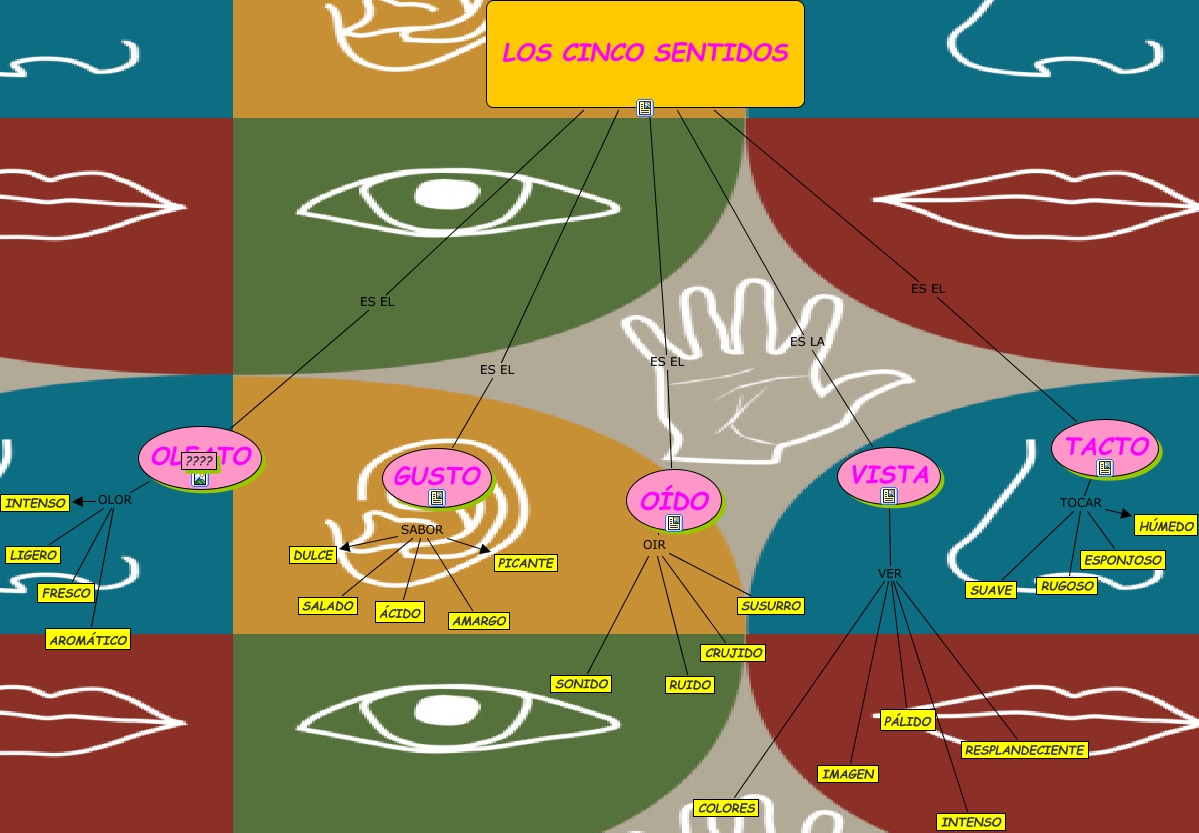 Este Cmap, tiene información relacionada con: LOS SENTIDOS, LOS CINCO SENTIDOS ES EL OLFATO, TACTO TOCAR SUAVE, OÍDO OIR SONIDO, OLFATO OLOR AROMÁTICO, LOS CINCO SENTIDOS ES EL GUSTO, VISTA VER COLORES, OLFATO OLOR LIGERO, TACTO TOCAR ESPONJOSO, VISTA VER PÁLIDO, VISTA VER RESPLANDECIENTE, OLFATO ???? ????, TACTO TOCAR HÚMEDO, TACTO TOCAR RUGOSO, OÍDO OIR SUSURRO, OÍDO OIR CRUJIDO, LOS CINCO SENTIDOS ES EL OÍDO, LOS CINCO SENTIDOS ES EL TACTO, VISTA VER INTENSO, OLFATO OLOR INTENSO, SALADO SABOR DULCE