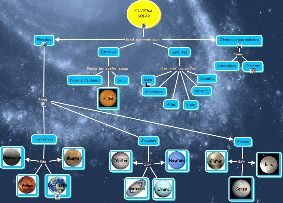 Este Cmap, tiene información relacionada con: sistema_solar, Planetas Tipos Jovianos, Jovianos Són Saturno, Estrellas Entre las cuales estan El Sol, Planetas Tipos Terrestres, Otros cuerpos celestes Como Cometas, Estrellas Entre las cuales estan Sirio, Jovianos Són Neptuno, Satélites Los mas conocidos Ganímedes, Jovianos Són Urano, Estrellas Entre las cuales estan Próxima Centauri, Satélites Los mas conocidos Atlas, Satélites Los mas conocidos Nereida, Satélites Los mas conocidos Luna, Planetas Tipos Enanos, Enanos Són Eris, Terrestres Són Venus, Enanos Són Ceres, Otros cuerpos celestes Como Asteroides, SISTEMA SOLAR Está formado por Satélites, SISTEMA SOLAR Está formado por Otros cuerpos celestes