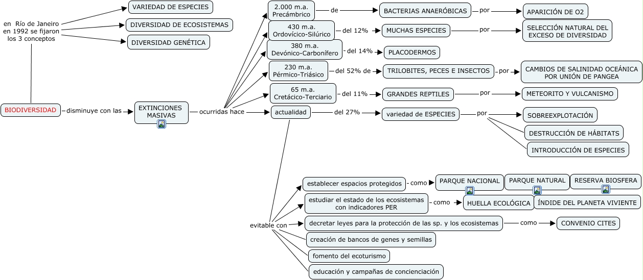 Este Cmap, tiene información relacionada con: A5 BIODIVERSIDAD, MUCHAS ESPECIES por SELECCIÓN NATURAL DEL EXCESO DE DIVERSIDAD, EXTINCIONES MASIVAS ocurridas hace actualidad, EXTINCIONES MASIVAS ocurridas hace 430 m.a. Ordovícico-Silúrico, TRILOBITES, PECES E INSECTOS por CAMBIOS DE SALINIDAD OCEÁNICA POR UNIÓN DE PANGEA, variedad de ESPECIES por DESTRUCCIÓN DE HÁBITATS, actualidad evitable con creación de bancos de genes y semillas, actualidad evitable con fomento del ecoturismo, actualidad evitable con estudiar el estado de los ecosistemas con indicadores PER, actualidad del 27% variedad de ESPECIES, establecer espacios protegidos como PARQUE NACIONAL, actualidad evitable con decretar leyes para la protección de las sp. y los ecosistemas, actualidad evitable con educación y campañas de concienciación, estudiar el estado de los ecosistemas con indicadores PER como HUELLA ECOLÓGICA, 430 m.a. Ordovícico-Silúrico del 12% MUCHAS ESPECIES, 230 m.a. Pérmico-Triásico del 52% de TRILOBITES, PECES E INSECTOS, variedad de ESPECIES por INTRODUCCIÓN DE ESPECIES, BACTERIAS ANAERÓBICAS por APARICIÓN DE O2, BIODIVERSIDAD disminuye con las EXTINCIONES MASIVAS, 2.000 m.a. Precámbrico de BACTERIAS ANAERÓBICAS, BIODIVERSIDAD en Río de Janeiro en 1992 se fijaron los 3 conceptos DIVERSIDAD DE ECOSISTEMAS