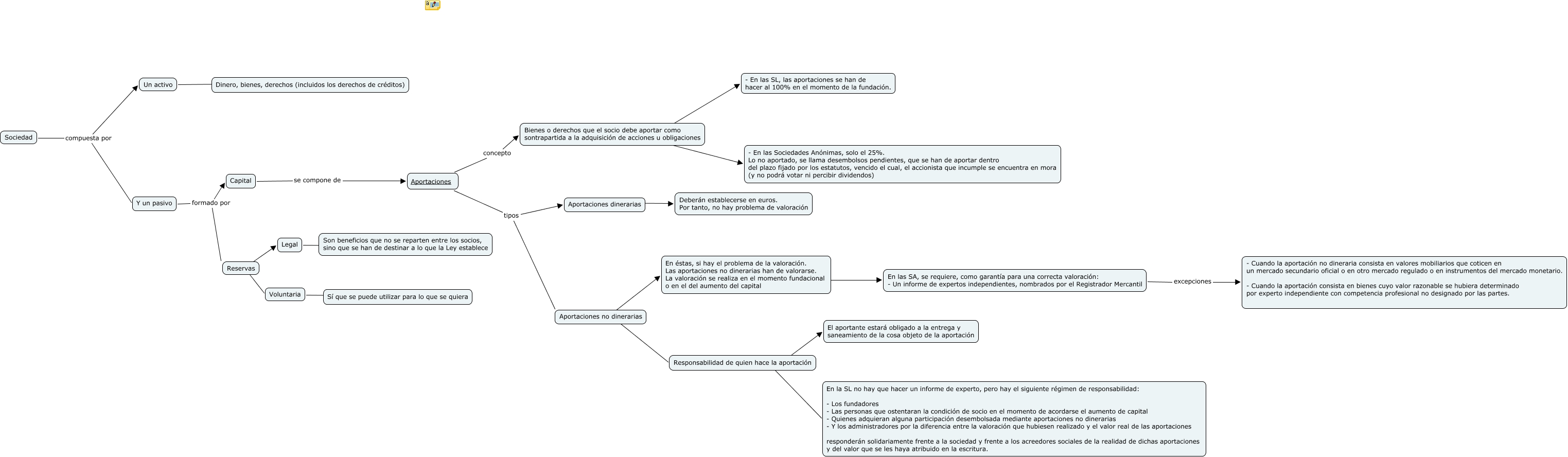 Este Cmap, tiene información relacionada con: Mercantil II- Caso 2, Aportaciones no dinerarias ???? Responsabilidad de quien hace la aportación, Capital se compone de Aportaciones, Bienes o derechos que el socio debe aportar como sontrapartida a la adquisición de acciones u obligaciones ???? - En las SL, las aportaciones se han de hacer al 100% en el momento de la fundación., Reservas ???? Legal, Legal ???? Son beneficios que no se reparten entre los socios, sino que se han de destinar a lo que la Ley establece, Y un pasivo formado por Reservas, Aportaciones no dinerarias ???? En éstas, si hay el problema de la valoración. Las aportaciones no dinerarias han de valorarse. La valoración se realiza en el momento fundacional o en el del aumento del capital, Sociedad compuesta por Un activo, Aportaciones concepto Bienes o derechos que el socio debe aportar como sontrapartida a la adquisición de acciones u obligaciones, Bienes o derechos que el socio debe aportar como sontrapartida a la adquisición de acciones u obligaciones ???? - En las Sociedades Anónimas, solo el 25%. Lo no aportado, se llama desembolsos pendientes, que se han de aportar dentro del plazo fijado por los estatutos, vencido el cual, el accionista que incumple se encuentra en mora (y no podrá votar ni percibir dividendos), Aportaciones tipos Aportaciones no dinerarias, En las SA, se requiere, como garantía para una correcta valoración: - Un informe de expertos independientes, nombrados por el Registrador Mercantil excepciones - Cuando la aportación no dineraria consista en valores mobiliarios que coticen en un mercado secundario oficial o en otro mercado regulado o en instrumentos del mercado monetario. - Cuando la aportación consista en bienes cuyo valor razonable se hubiera determinado por experto independiente con competencia profesional no designado por las partes., Y un pasivo formado por Capital, Reservas ???? Voluntaria, Aportaciones tipos Aportaciones dinerarias, Responsabilidad de quien hace la aportación ???? En la SL no hay que hacer un informe de experto, pero hay el siguiente régimen de responsabilidad: - Los fundadores - Las personas que ostentaran la condición de socio en el momento de acordarse el aumento de capital - Quienes adquieran alguna participación desembolsada mediante aportaciones no dinerarias - Y los administradores por la diferencia entre la valoración que hubiesen realizado y el valor real de las aportaciones responderán solidariamente frente a la sociedad y frente a los acreedores sociales de la realidad de dichas aportaciones y del valor que se les haya atribuido en la escritura., Sociedad compuesta por Y un pasivo, Aportaciones dinerarias ???? Deberán establecerse en euros. Por tanto, no hay problema de valoración, Responsabilidad de quien hace la aportación ???? El aportante estará obligado a la entrega y saneamiento de la cosa objeto de la aportación, En éstas, si hay el problema de la valoración. Las aportaciones no dinerarias han de valorarse. La valoración se realiza en el momento fundacional o en el del aumento del capital ???? En las SA, se requiere, como garantía para una correcta valoración: - Un informe de expertos independientes, nombrados por el Registrador Mercantil