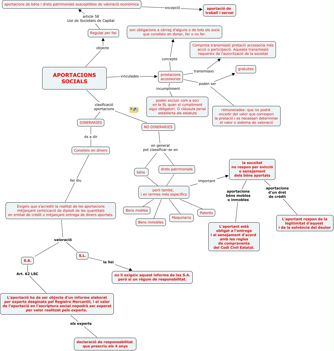 Este Cmap, tiene información relacionada con: Aportacions Socials, APORTACIONS SOCIALS objecte Regulat per llei, però també, i en termes més específics Maquinaria, prestacions accessories concepte son obligacions a càrreg d'alguns o de tots els socis que consiteix en donar, fer o no fer., Consiteix en diners llei diu Exigeix que s'acrediti la realitat de les aportacions mitjançant certicicació de dipòsit de les quantitats en entitat de crèdit o mitjançant entrega de diners aportats., S.L. la llei no li exigeix aquest informe de las S.A. però si un régum de responsbilitat., Exigeix que s'acrediti la realitat de les aportacions mitjançant certicicació de dipòsit de les quantitats en entitat de crèdit o mitjançant entrega de diners aportats. valoració S.L., APORTACIONS SOCIALS clasificació aportacions NO DINERARIES, prestacions accessories poden ser gratuites, la soceitat no respon per evicció o sanajament dels béns aportats aportacions béns mobles o inmobles L'aportant està obligat a l'entrega i el senajament d'acord amb les regles de compraventa del Codi Civil Estatal., APORTACIONS SOCIALS vinculades prestacions accessories, drets patrimonials ???? però també, i en termes més específics, prestacions accessories transmissio Comprota transmissió pretació accessoria més acció o participació. Aquesta transmissió requereix de l'autorització de la societat, la soceitat no respon per evicció o sanajament dels béns aportats aportacions d'un dret de crédit L'aportant respon de la legitimitat d'aquest i de la solvència del deutor, aportacions de béns i drets patrimonials susceptibles de valoració econòmica excepció aportació de treball i servei, L'aportació ha de ser objecte d'un informe elaborat per experts desginats pel Registre Mercantil, i el valor de l'aportació en l'escriptura social nopodrà ser superat per valor realitzat pels experts. els experts declaració de responsabilitat que prescriu els 4 anys, però també, i en termes més específics ???? Bens mobles, prestacions accessories incumpliment poden excluir com a soci en la SL quan el cumpliment sigui obligatori. O cláusula penal establerta als estatuts, NO DINERARIES en general pot classificar-se en béns, NO DINERARIES en general pot classificar-se en drets patrimonials, APORTACIONS SOCIALS clasificació aportacions DINERARIES