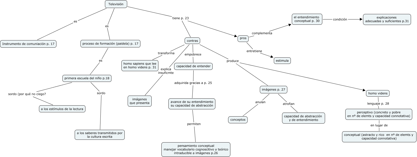 Este Cmap, tiene información relacionada con: Homo Videns2, capacidad de entender adquirida gracias a p. 25 avance de su entendimiento su capacidad de abstracción, pros entretiene estimula, Televisión tiene p. 23 pros, Televisión es Instrumento de comuniación p. 17, contras explica insuficmte imágenes que presenta, homo videns lenguaje p. 28 perceptivo (concreto y pobre en nº de elemts y capacidad connotativa), primera escuela del niño p.18 sordo a los saberes transmitidos por la cultura escrita, pros complementa el entendimiento conceptual p. 30, contras empobrece capacidad de entender, perceptivo (concreto y pobre en nº de elemts y capacidad connotativa) en lugar de conceptual (astracto y rico en nº de elemts y capacidad connotativa), proceso de formación (paideía) p. 17 es primera escuela del niño p.18, primera escuela del niño p.18 sordo (por qué no ciego? a los estímulos de la lectura, contras produce imágenes p. 27, contras produce homo videns, contras transforma homo sapiens que lee en homo videns p. 31, el entendimiento conceptual p. 30 condición explicaciones adecuadas y suficientes p.31, imágenes p. 27 atrofian capacidad de abstracción y de entendimiento, avance de su entendimiento su capacidad de abstracción permiten pensamiento conceptual manejar vocabulario cognoscitivo y teórico intraducible a imágenes p.26, imágenes p. 27 anulan conceptos, Televisión tiene p. 23 contras