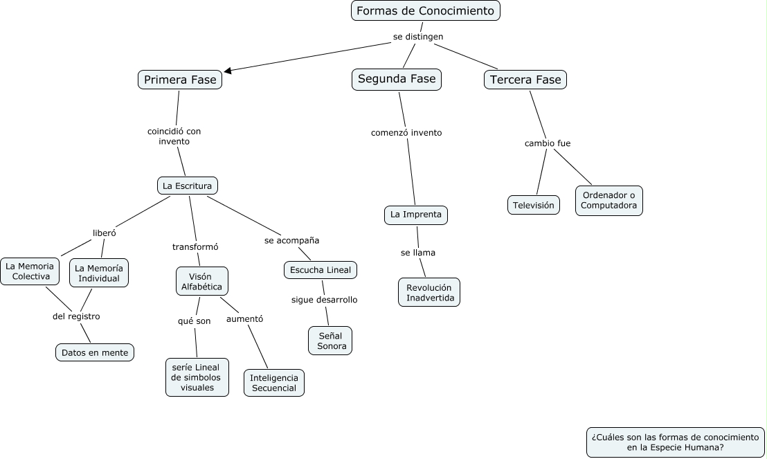 Este Cmap, tiene información relacionada con: TERCERA FASE, Primera Fase coincidió con invento La Escritura, Formas de Conocimiento se distingen Tercera Fase, La Imprenta se llama Revolución Inadvertida, Segunda Fase comenzó invento La Imprenta, Formas de Conocimiento se distingen Primera Fase, Tercera Fase cambio fue Ordenador o Computadora, Visón Alfabética qué son seríe Lineal de simbolos visuales, La Escritura liberó La Memoria Colectiva, La Memoría Individual del registro Datos en mente, La Escritura liberó La Memoría Individual, Tercera Fase cambio fue Televisión, La Escritura se acompaña Escucha Lineal, Visón Alfabética aumentó Inteligencia Secuencial, La Memoria Colectiva del registro Datos en mente, La Escritura transformó Visón Alfabética, Formas de Conocimiento se distingen Segunda Fase, Escucha Lineal sigue desarrollo Señal Sonora