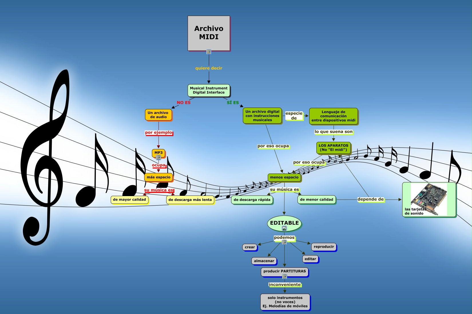 Este Cmap, tiene información relacionada con: Archivo MIDI, EDITABLE podemos almacenar, Archivo MIDI quiere decir Musical Instrument Digital Interface, de menor calidad depende de LOS APARATOS (No "El midi"), Un archivo de audio por ejemplo MP3, Musical Instrument Digital Interface NO ES Un archivo de audio, producir PARTITURAS inconveniente solo instrumentos (no voces) Ej. Melodías de móviles, de menor calidad depende de las tarjetas de sonido, menos espacio su música es de menor calidad, EDITABLE podemos producir PARTITURAS, EDITABLE podemos reproducir, más espacio su música es de mayor calidad, Un archivo digital con instrucciones musicales por eso ocupa menos espacio, MP3 ocupa más espacio, Musical Instrument Digital Interface SÍ ES Un archivo digital con instrucciones musicales, más espacio su música es de descarga más lenta, menos espacio su música es de descarga rápida, EDITABLE podemos editar, menos espacio su música es EDITABLE, LOS APARATOS (No "El midi") por eso ocupa menos espacio, Un archivo digital con instrucciones musicales especie de Lenguaje de comunicación entre dispositivos midi