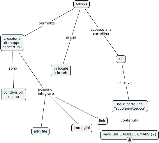 Questa Cmap, creata con IHMC CmapTools, contiene informazioni relative a: 1C, 1C si trova nella cartellina "scuolamatteucci", cmaps si usa in locale o in rete, creazione di mappe concettuali possono integrare immagini, cmaps permette creazione di mappe concettuali, nella cartellina "scuolamatteucci" contenuta negli IMHC PUBLIC CMAPS (2), creazione di mappe concettuali sono condivisibili online, creazione di mappe concettuali possono integrare link, cmaps accesso alla cartellina 1C, creazione di mappe concettuali possono integrare altri file