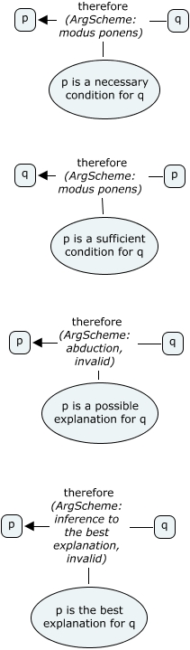 This Concept Map, created with IHMC CmapTools, has information related to: abduction, p therefore (ArgScheme: modus ponens) q, q therefore (ArgScheme: inference to the best explanation, invalid) p, p is a possible explanation for q therefore (ArgScheme: abduction, invalid) p, q therefore (ArgScheme: modus ponens) p, p is a necessary condition for q therefore (ArgScheme: modus ponens) p, q therefore (ArgScheme: abduction, invalid) p, p is a sufficient condition for q therefore (ArgScheme: modus ponens) q, p is the best explanation for q therefore (ArgScheme: inference to the best explanation, invalid) p