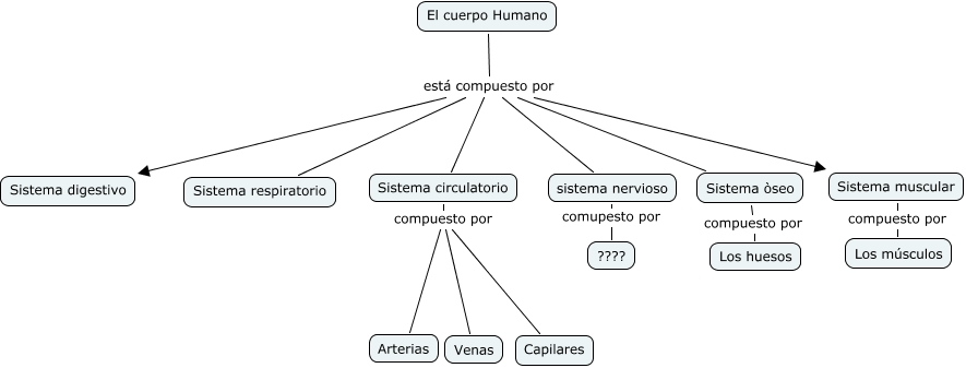 Este Cmap, tiene información relacionada con: El cuerpo humano, El cuerpo Humano está compuesto por Sistema respiratorio, Sistema òseo compuesto por Los huesos, El cuerpo Humano está compuesto por Sistema digestivo, El cuerpo Humano está compuesto por sistema nervioso, El cuerpo Humano está compuesto por Sistema circulatorio, Sistema circulatorio compuesto por Venas, sistema nervioso comupesto por ????, Sistema muscular compuesto por Los músculos, El cuerpo Humano está compuesto por Sistema muscular, Sistema circulatorio compuesto por Capilares, El cuerpo Humano está compuesto por Sistema òseo, Sistema circulatorio compuesto por Arterias