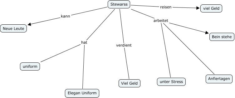 Questa Cmap, creata con IHMC CmapTools, contiene informazioni relative a: Stewarss, Stewarss hat Elegan Uniform, Stewarss verdient Viel Geld, Stewarss hat uniform, Stewarss reisen viel Geld, Stewarss arbeitet Anfiertagen, Stewarss arbeitet unter Stress, Stewarss kann Neue Leute, Stewarss arbeitet Bein stehe