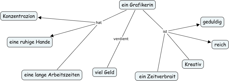 Questa Cmap, creata con IHMC CmapTools, contiene informazioni relative a: Grafikerin, ein Grafikerin ist Kreativ, ein Grafikerin hat Konzentrazion, ein Grafikerin ist ein Zeitverbrait, ein Grafikerin hat eine lange Arbeitszeiten, ein Grafikerin verdient viel Geld, ein Grafikerin ist reich, ein Grafikerin hat eine ruhige Hande, ein Grafikerin ist geduldig